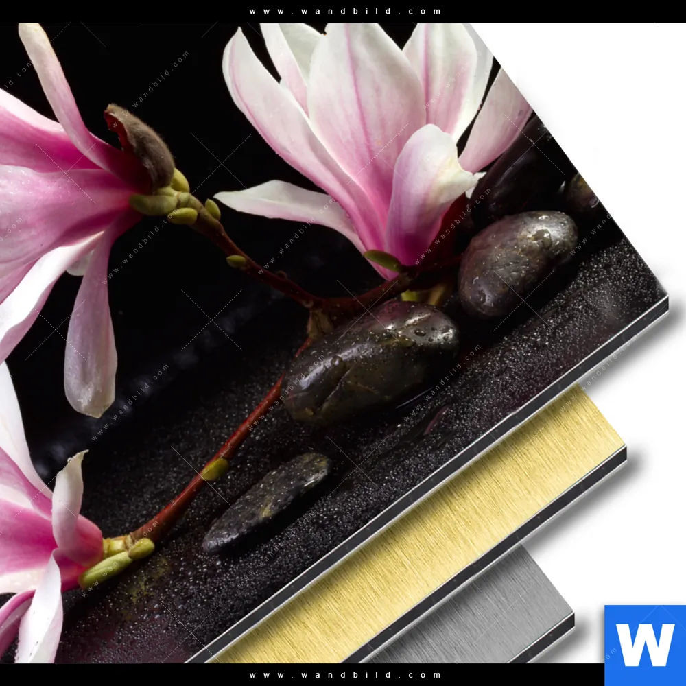 Aluminiumbild gebürstet | Magnolien & Zen Steine | Rund