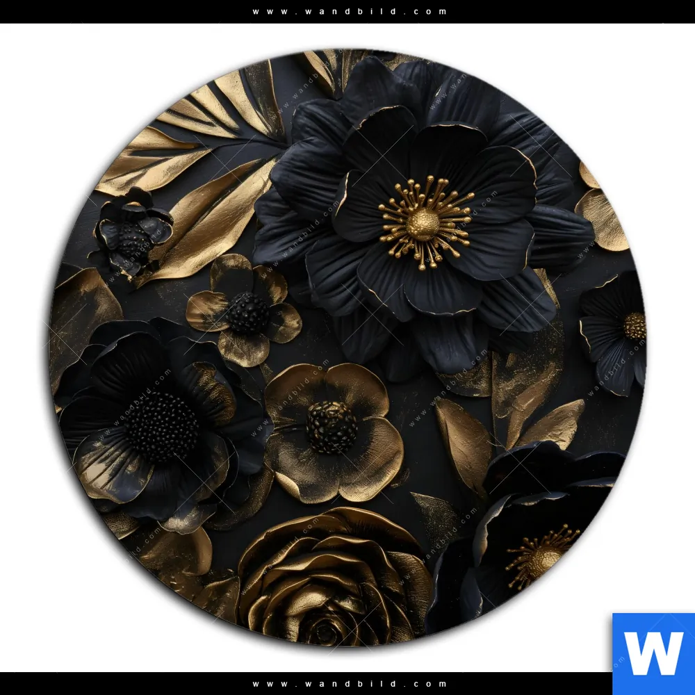Aluminiumbild gebürstet | Schwarze und goldene Blüten | Rund