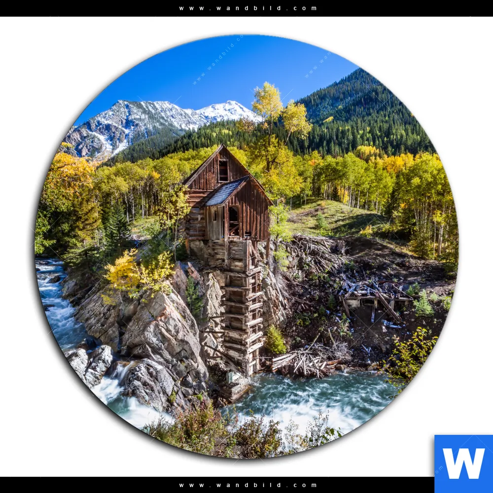 Aluminiumbild gebürstet | Waldhütte am Fluss | Rund