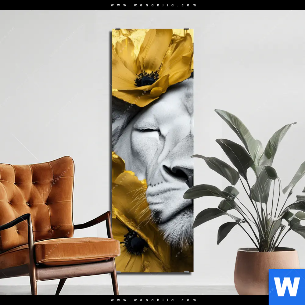 Alu-Dibond Bild | Weiße Löwin mit Goldblüten | Schmal
