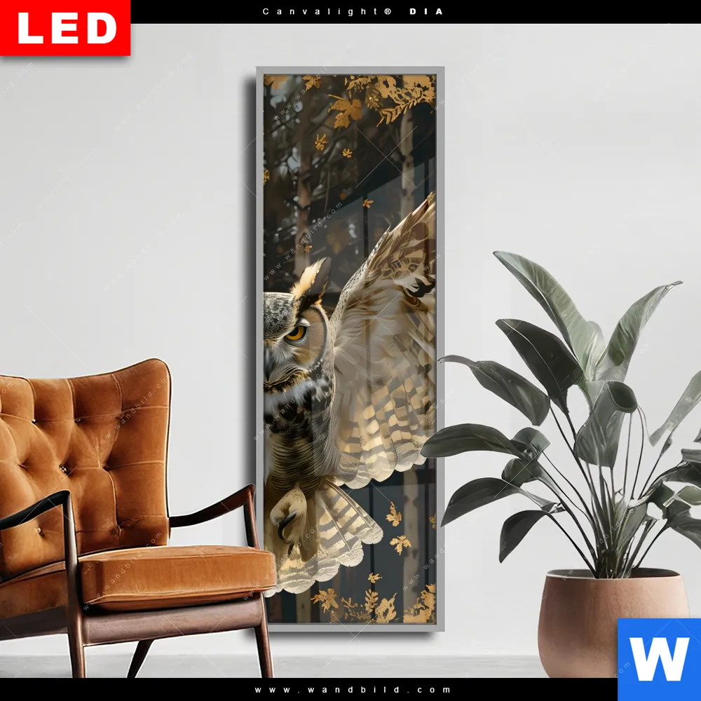 Wechselmotiv Acrylglas Canvalight® DIA | Eule inmitten goldener Blätter | Schmal