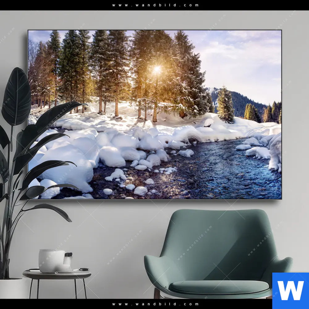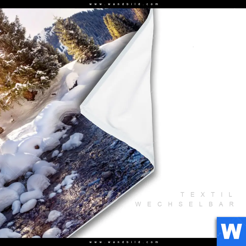 Wechselmotiv Textil | Schneebedeckte Landschaft am Fluss | Querformat