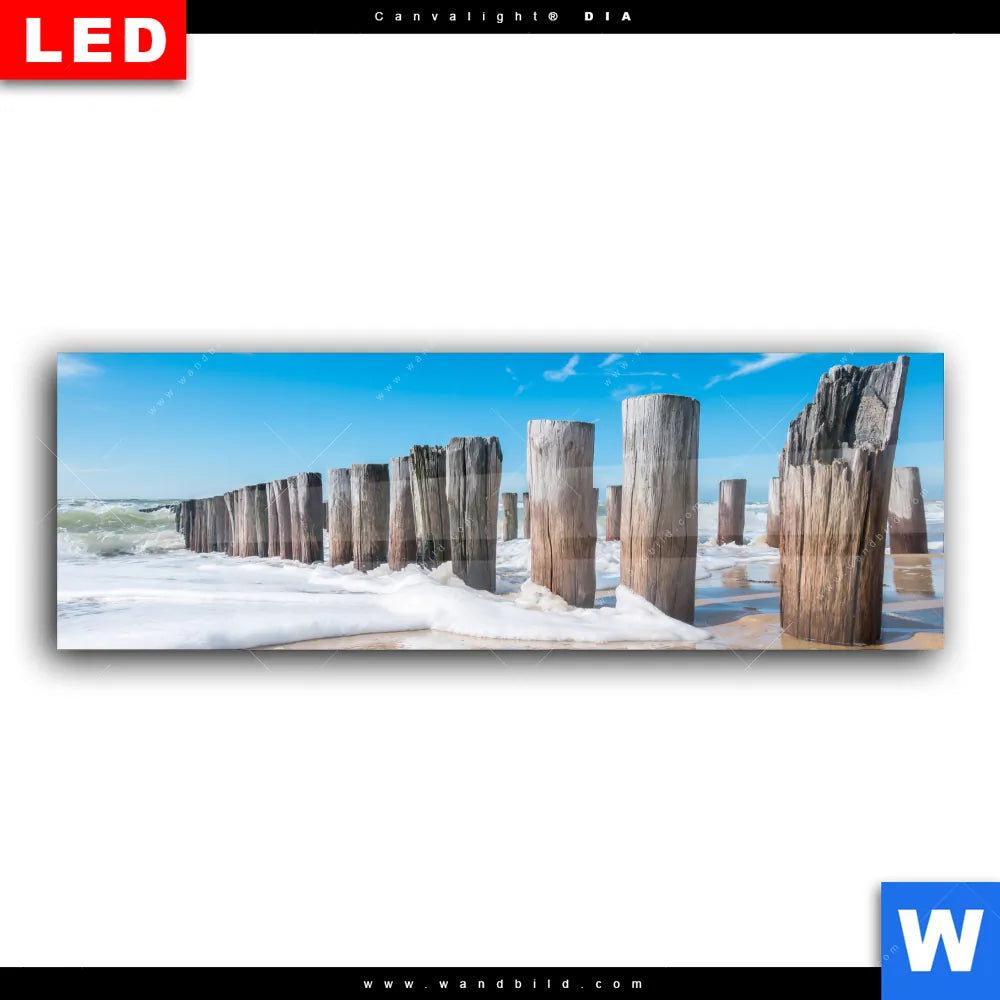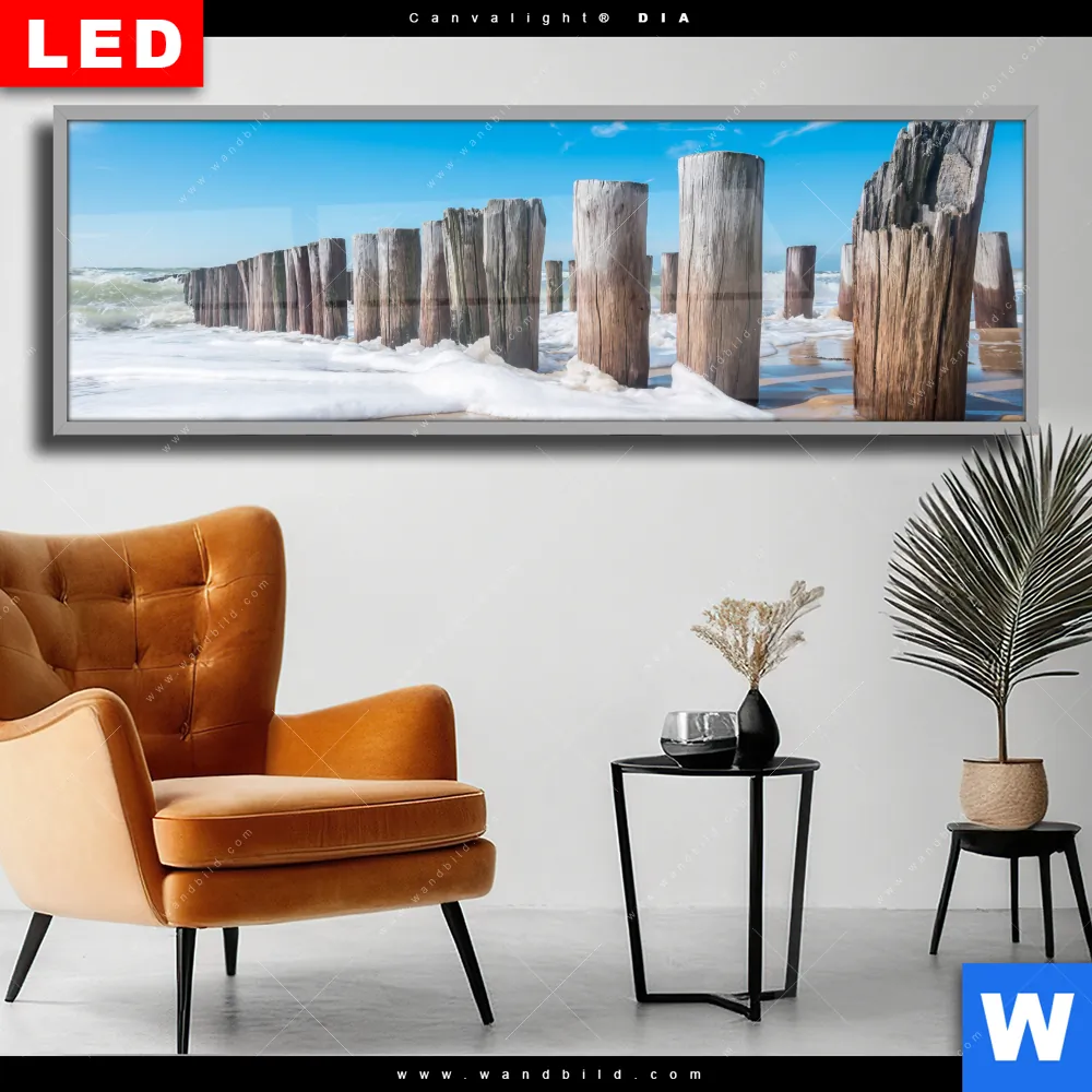 Wechselmotiv Acrylglas Canvalight® DIA | Buhnen in Wellen am Strand | Panorama