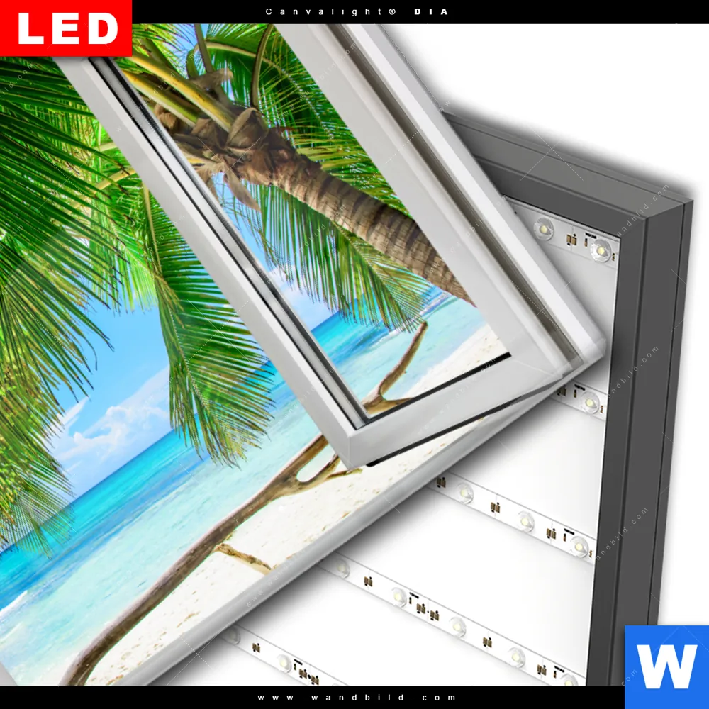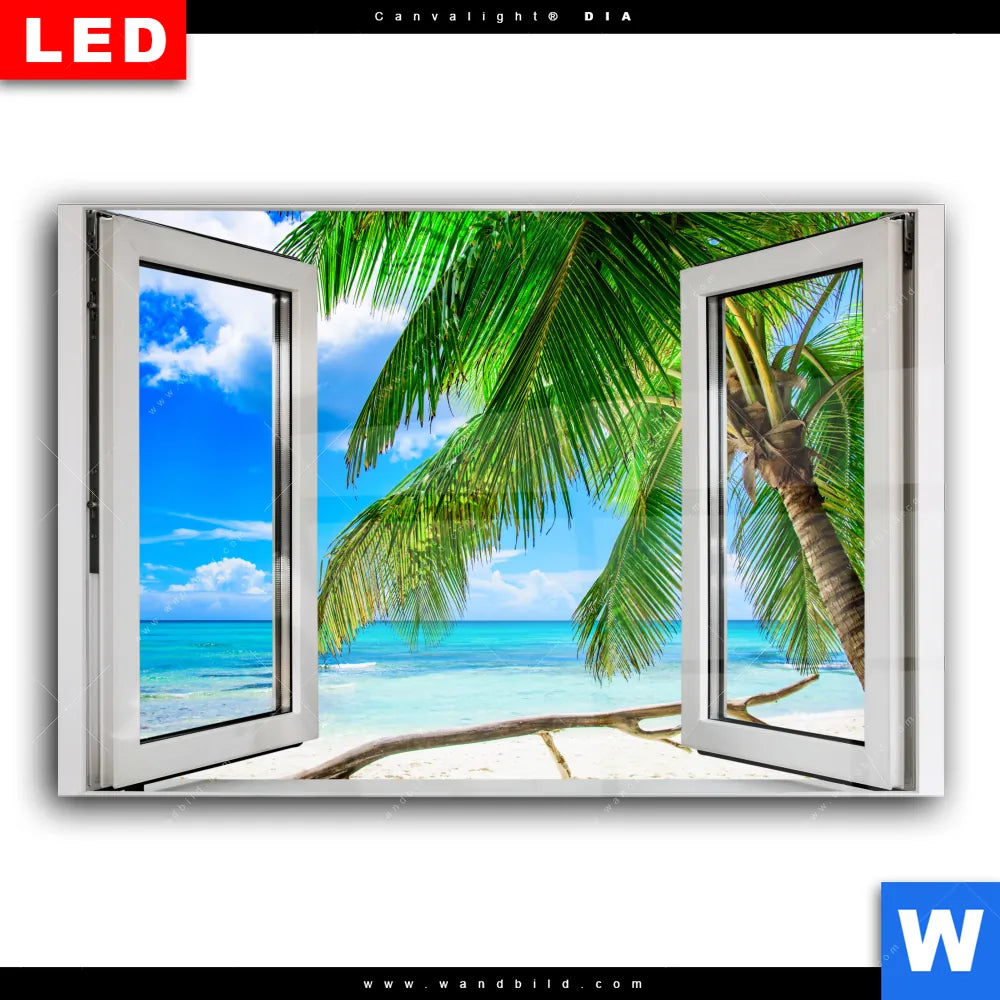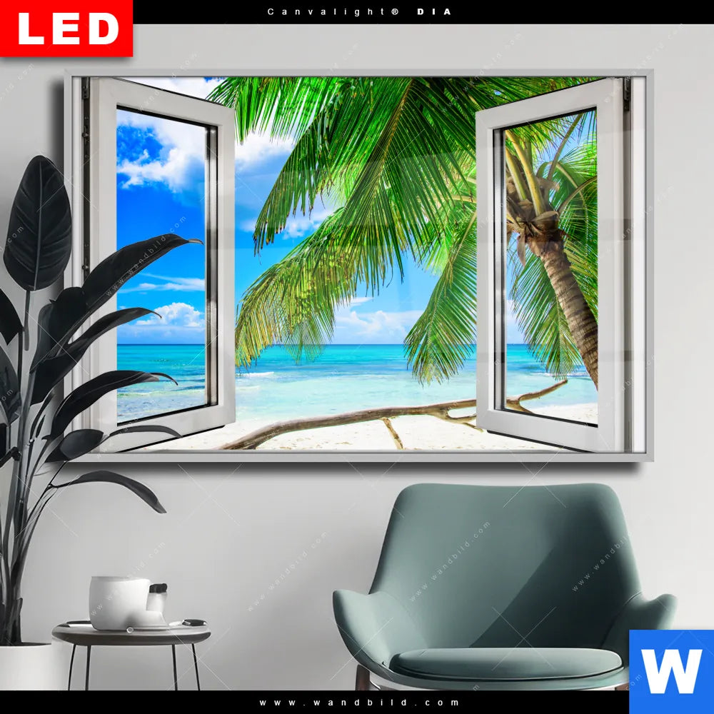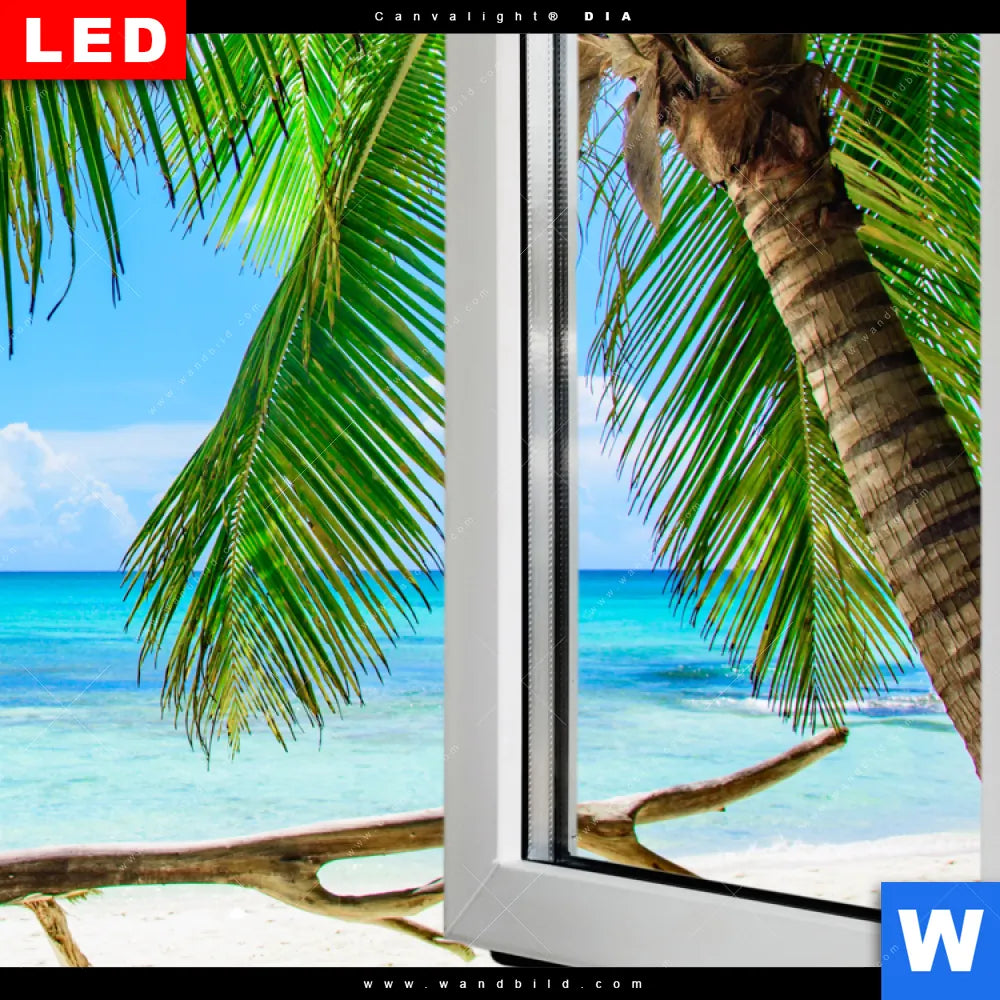 Wechselmotiv Acrylglas Canvalight® DIA | Fensterblick Karibik Palme | Querformat