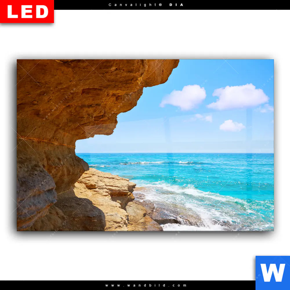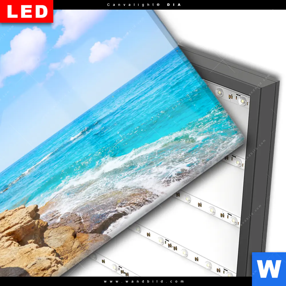 Wechselmotiv Acrylglas Canvalight® DIA | Wellenrauschen und Felsenklippe | Querformat