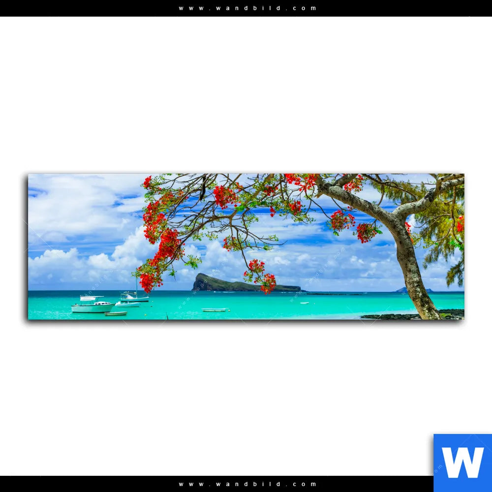 Leinwandbild | Rote Blüten und Türkisfarbenes Meer | Panorama
