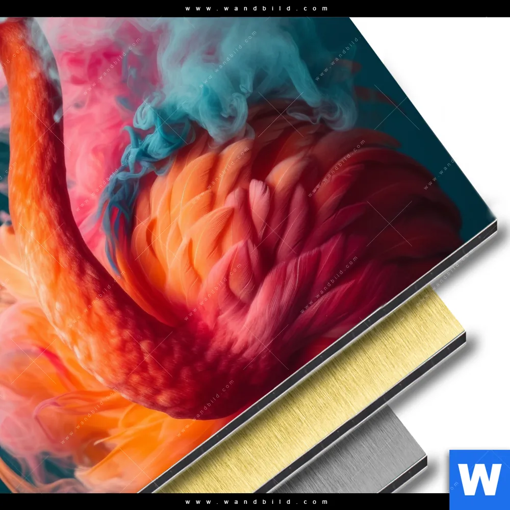 Aluminiumbild gebürstet | Flamingo in bunter Rauchwolke | Quadrat