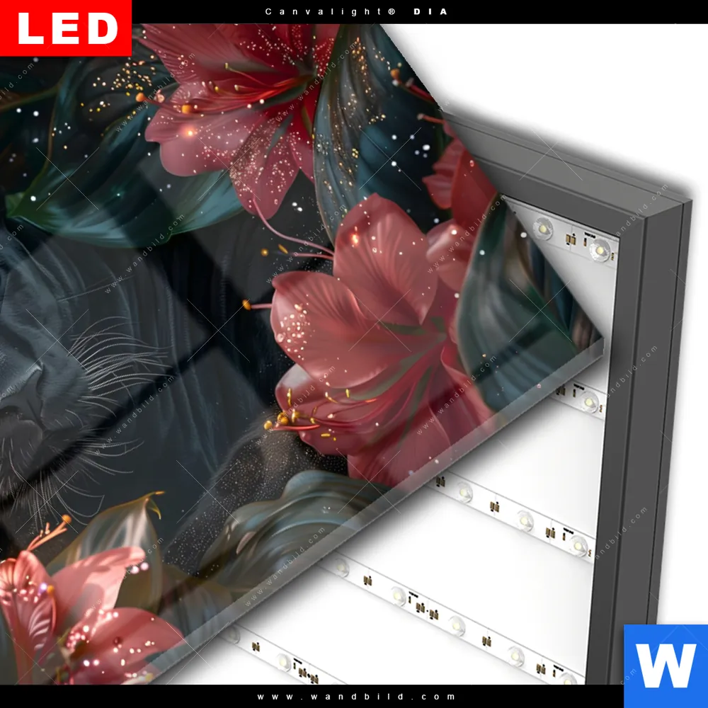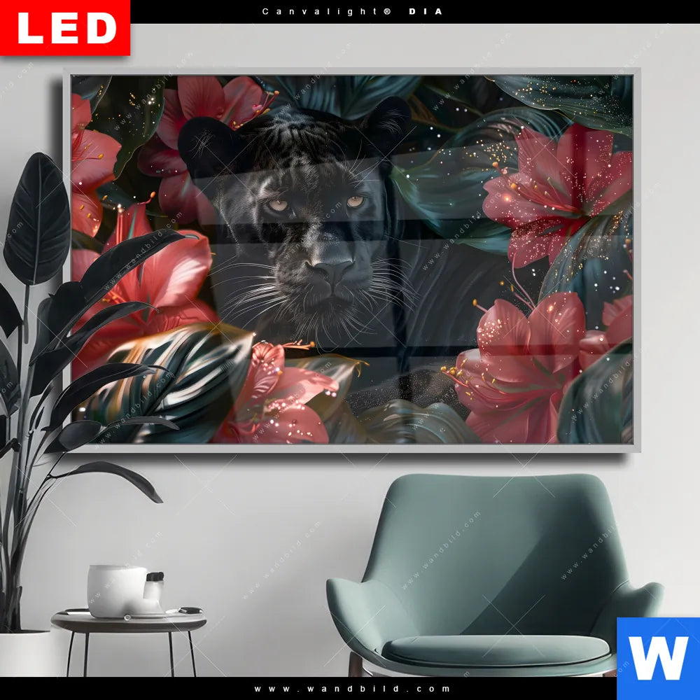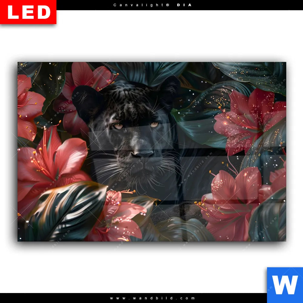 Wechselmotiv Acrylglas Canvalight® DIA | Panther und rote Blüten | Querformat
