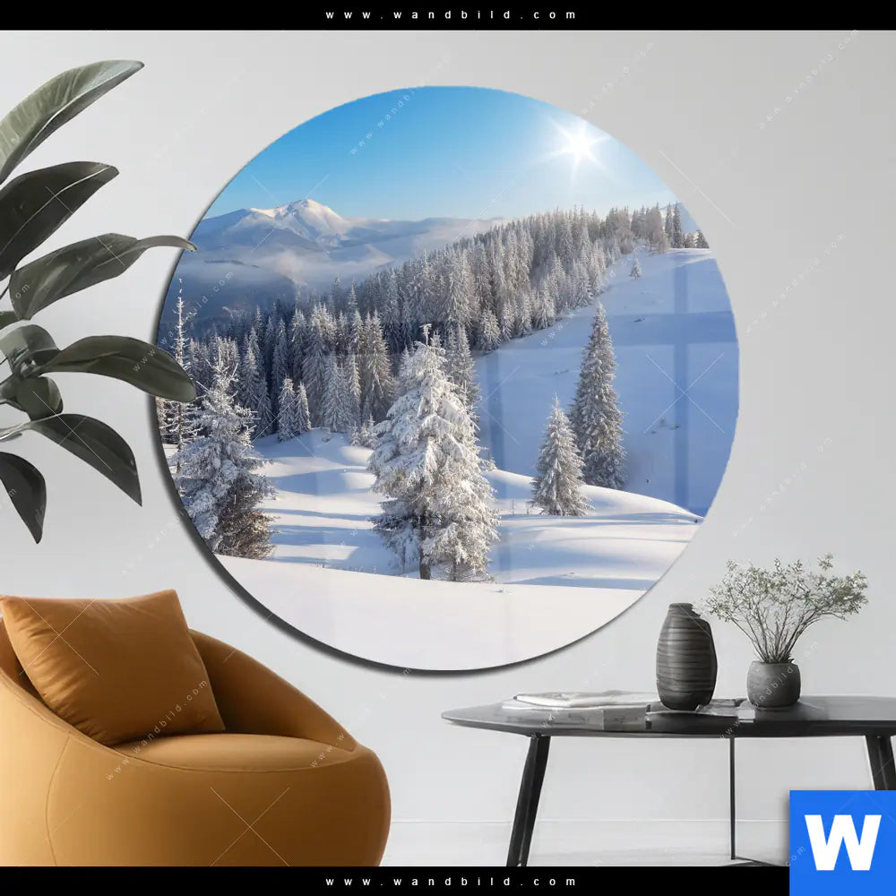 Acrylglasbild | Berge und Wälder in Schnee | Rund