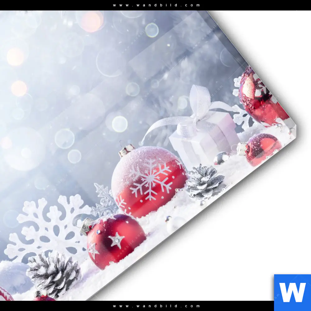Acrylglasbild | Weihnachtskugeln im Winterwunderland | Quadrat