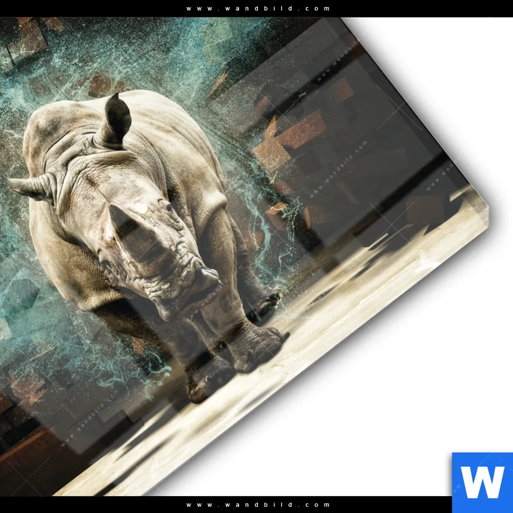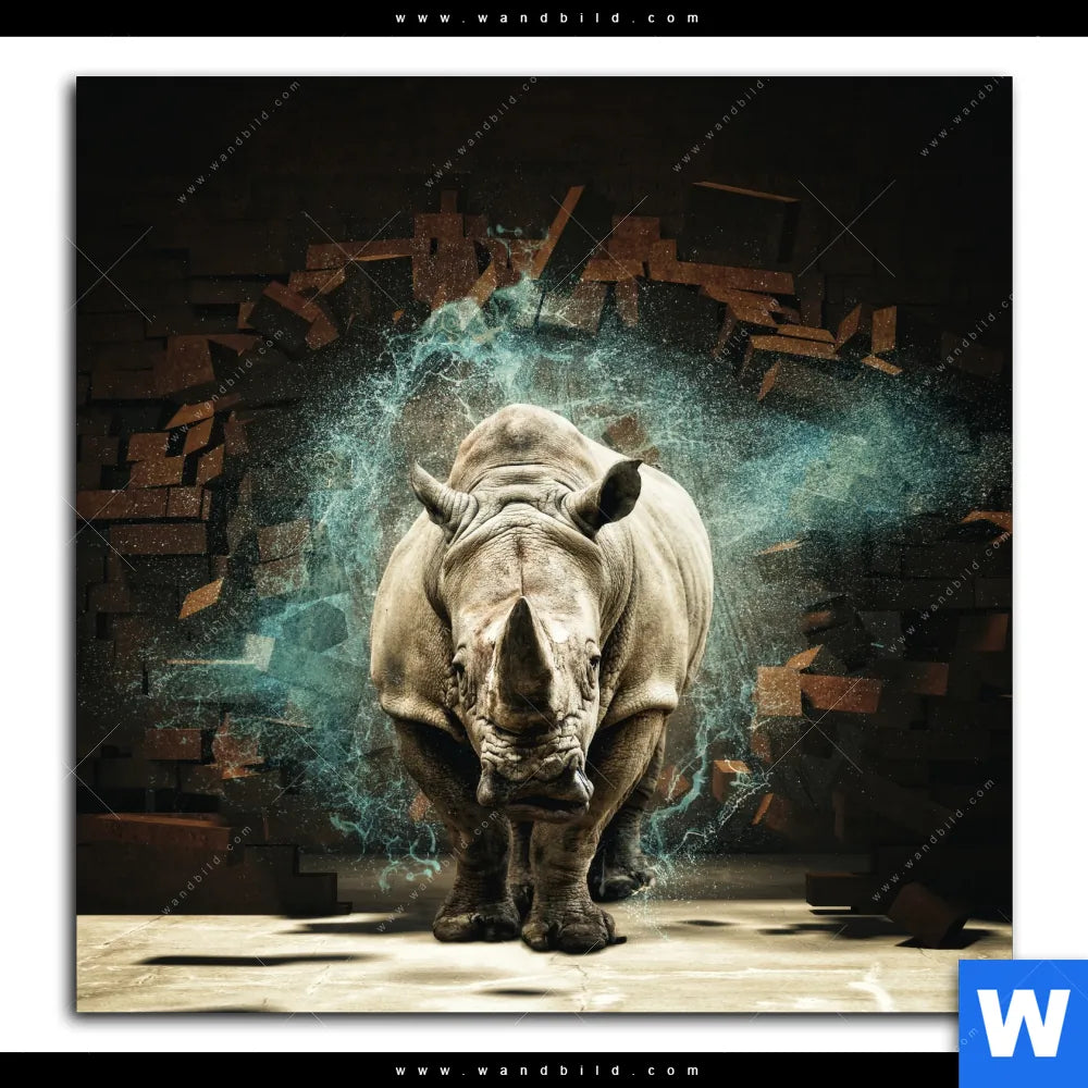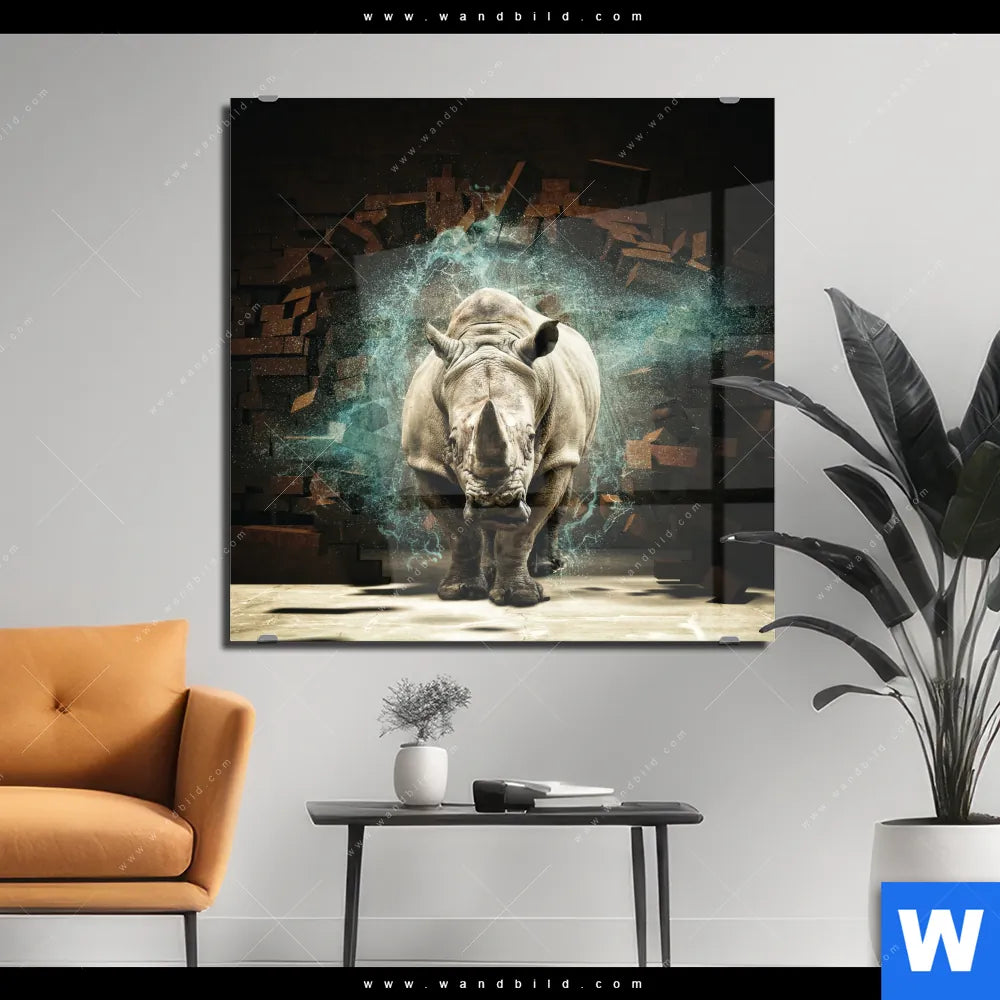Acrylglasbild | Nashorn zerstört Wand | Quadrat