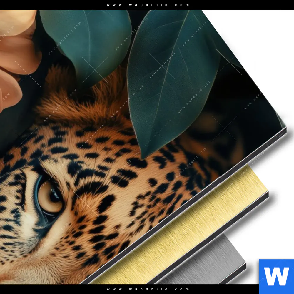 Aluminiumbild gebürstet | Leopard im Blütenmeer | Hochformat