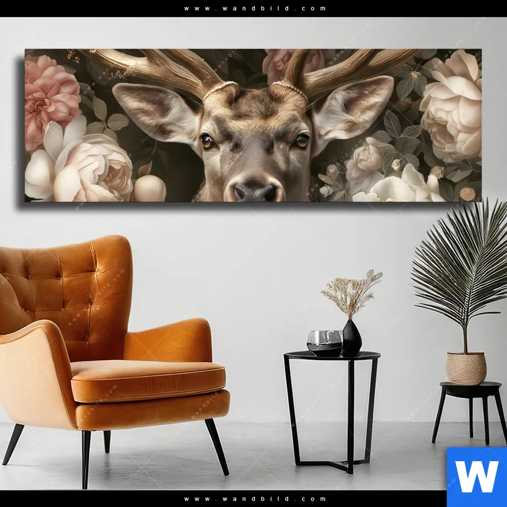 Leinwandbild | Romantischer Hirsch mit Blumen | Panorama