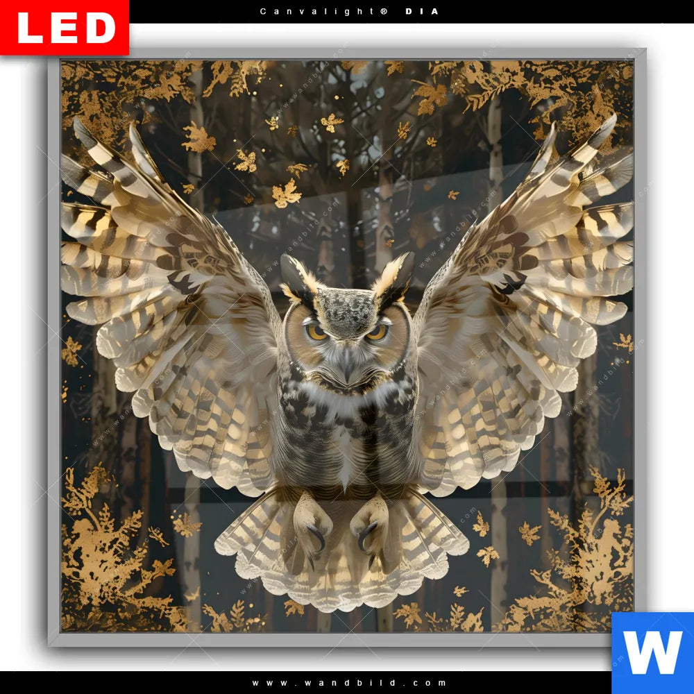 Canvalight® DIA Leuchtbild | Eule inmitten goldener Blätter | Quadrat