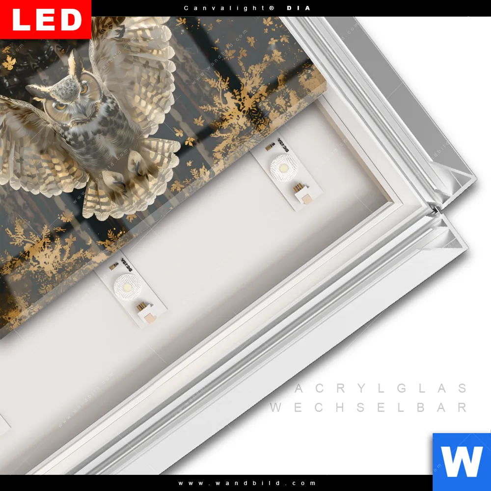 Canvalight® DIA Leuchtbild | Eule inmitten goldener Blätter | Querformat