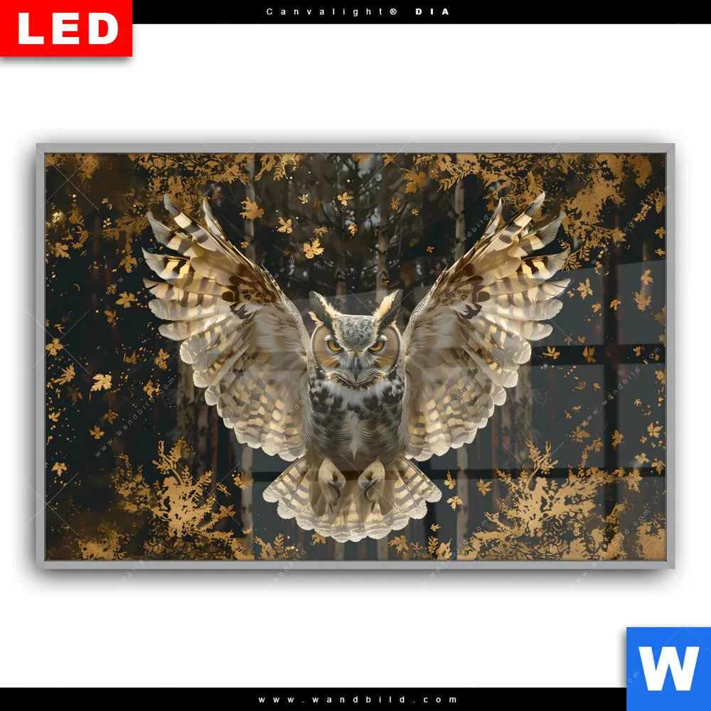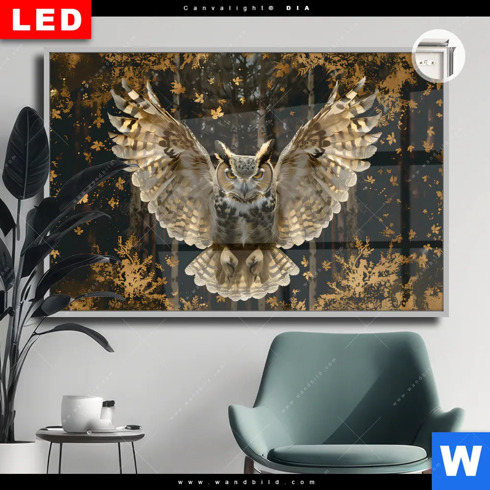 Leuchtbild Acrylglas Canvalight® DIA | Eule inmitten goldener Blätter | Querformat