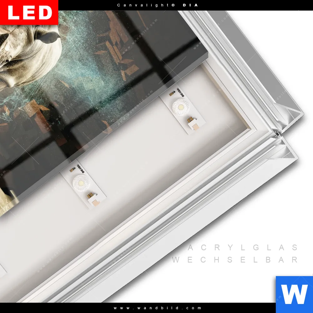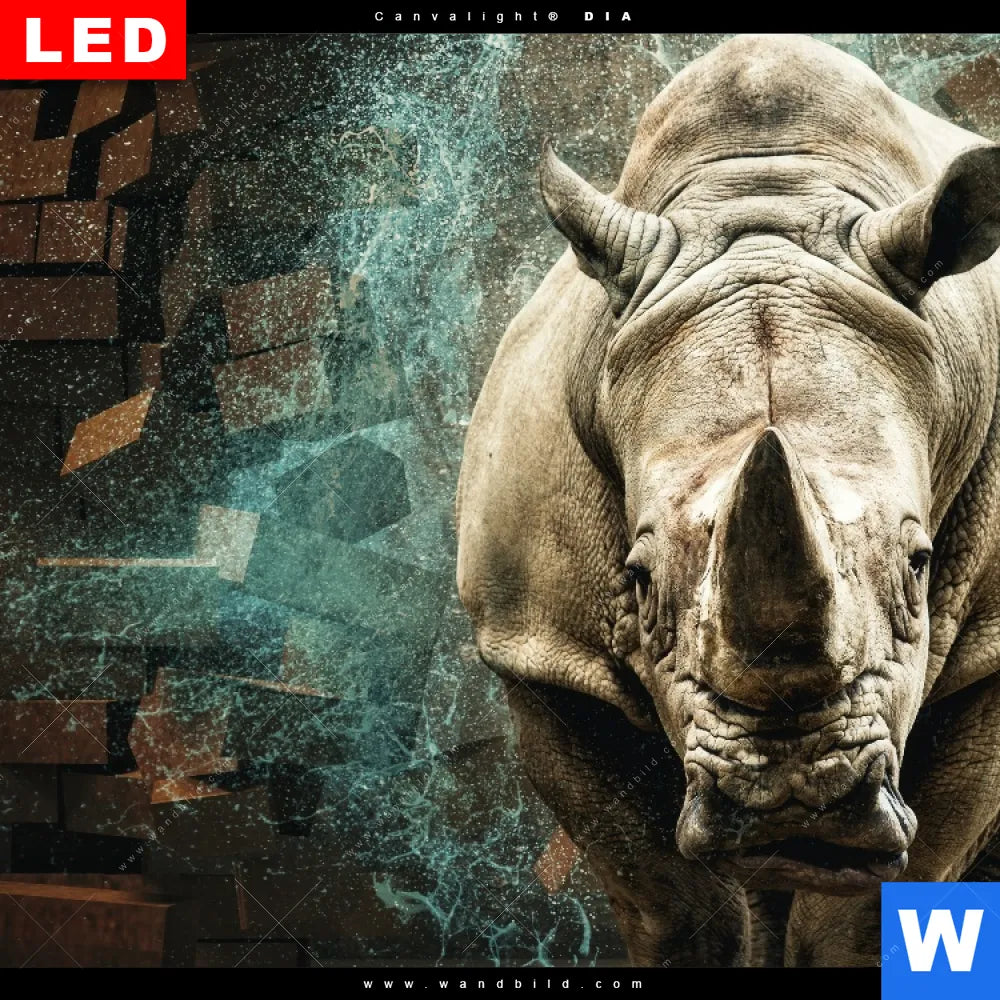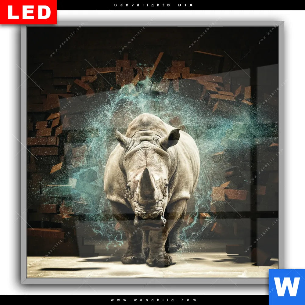 Canvalight® DIA Leuchtbild | Nashorn zerstört Wand | Quadrat