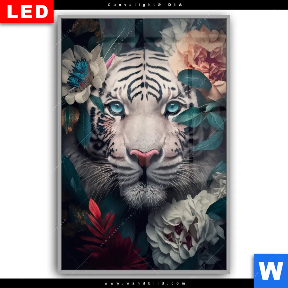 Canvalight® DIA Leuchtbild | Weißer Tiger mit blauen Augen zwischen Blumen | Hochformat