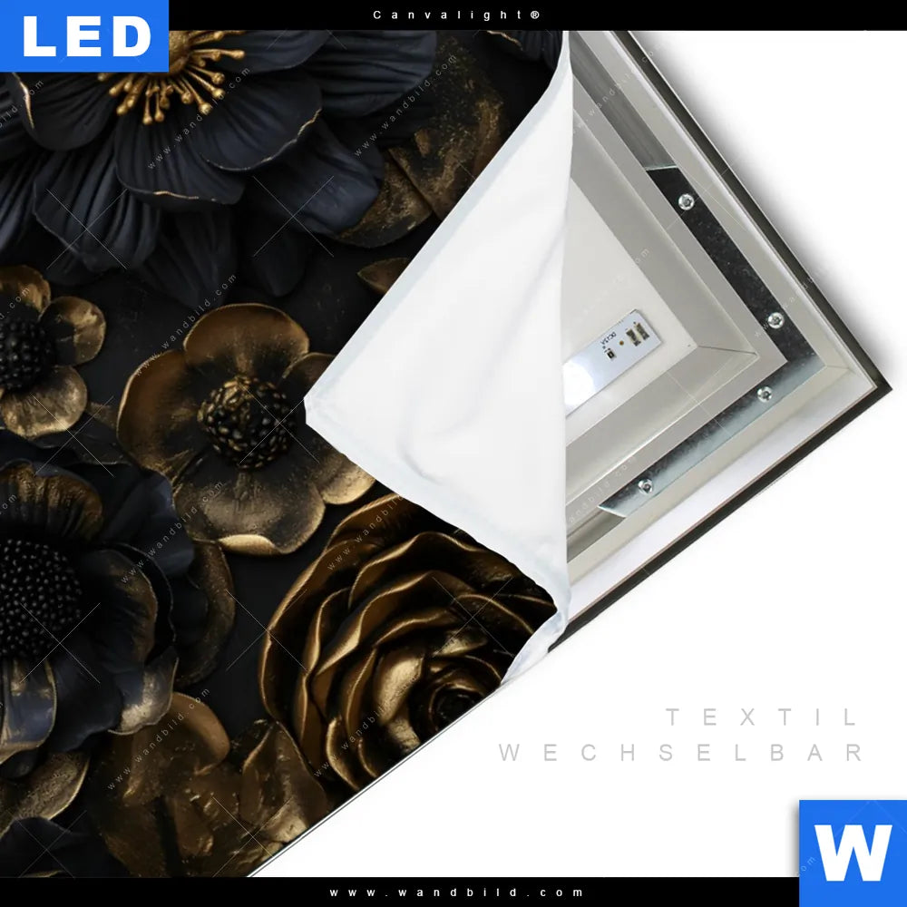 Canvalight® TEX Leuchtbild | Schwarze und goldene Blüten | Querformat