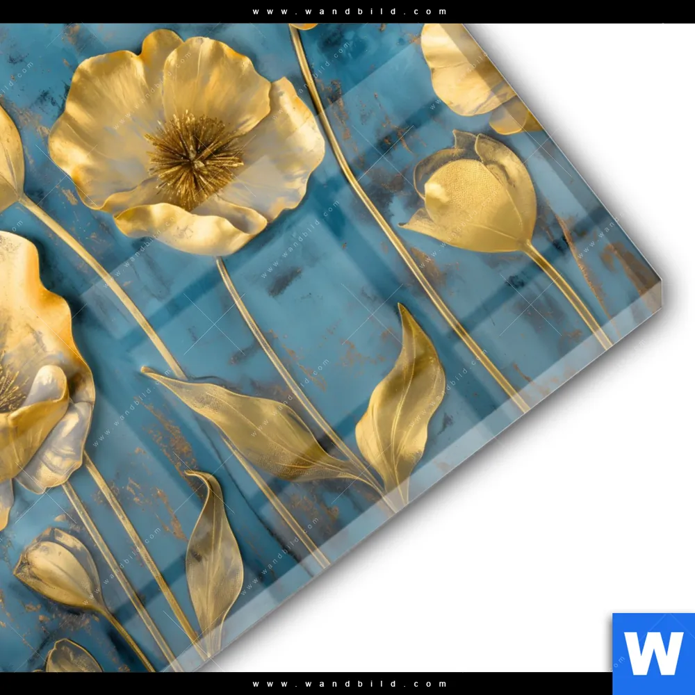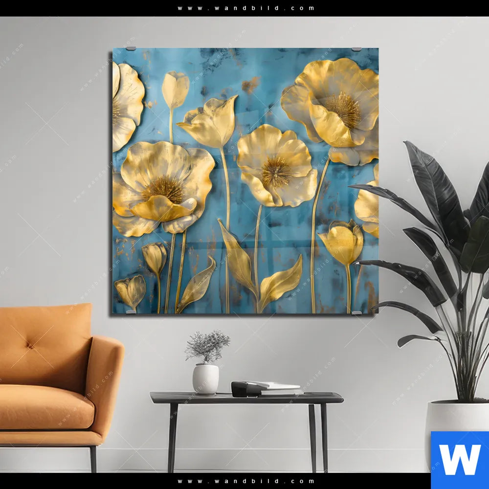 Acrylglasbild | Goldene Blumen auf Blau | Quadrat