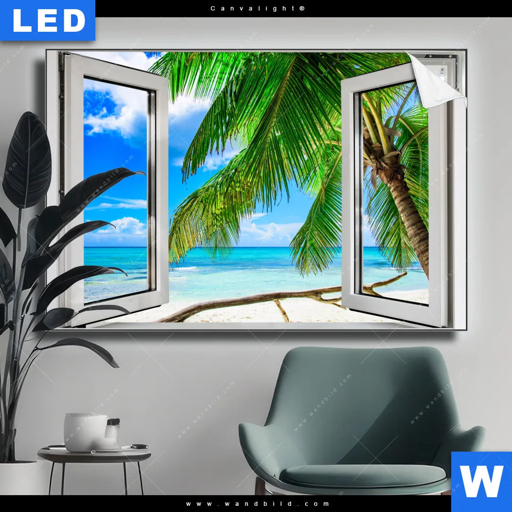 Canvalight® Leuchtbild | Fensterblick Karibik Palme | Querformat