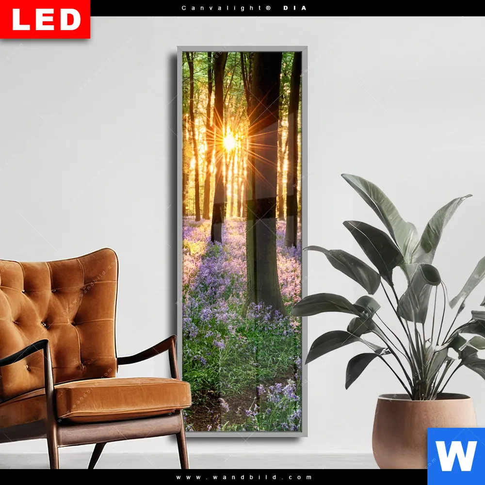 Wechselmotiv Acrylglas Canvalight® DIA | Blühender Wald bei Sonnenaufgang | Schmal