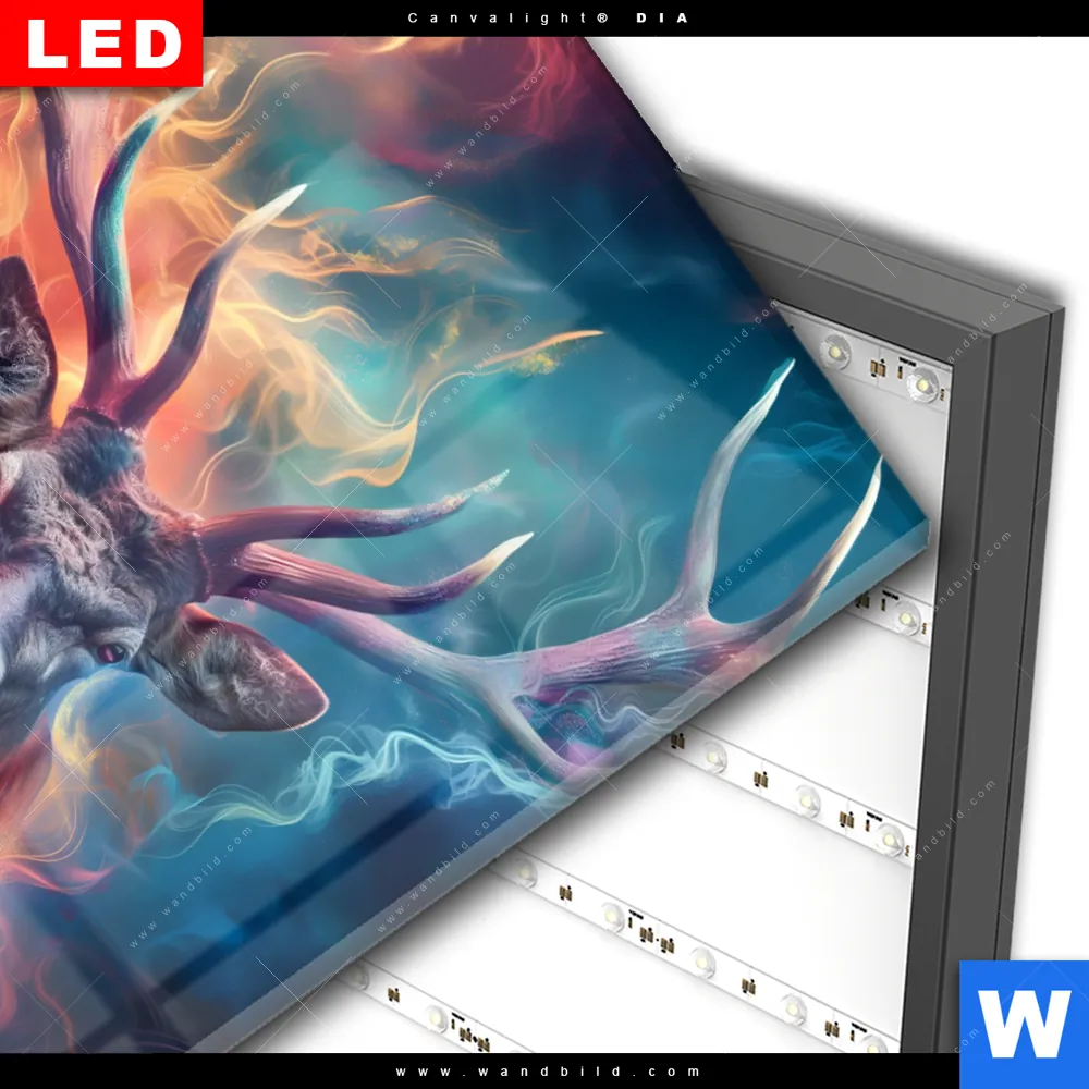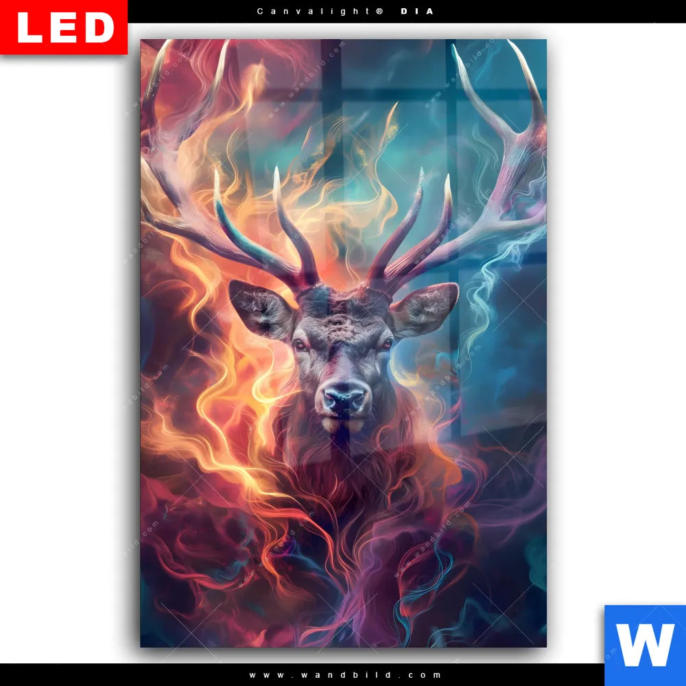 Wechselmotiv Acrylglas Canvalight® DIA | Bunter Hirsch in Flammen | Hochformat