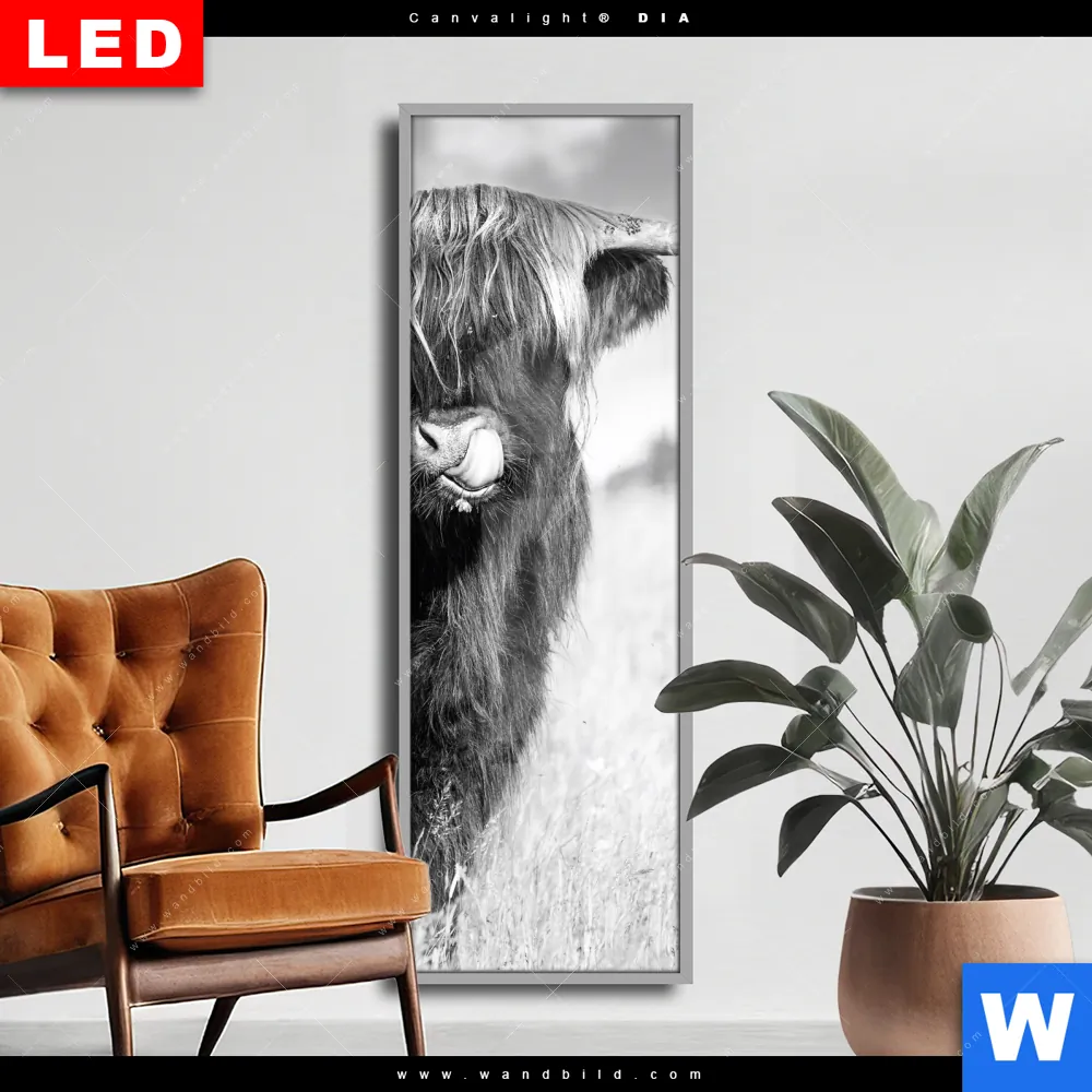 Wechselmotiv Acrylglas Canvalight® DIA | Hochlandkuh auf einer Wiese | Schmal