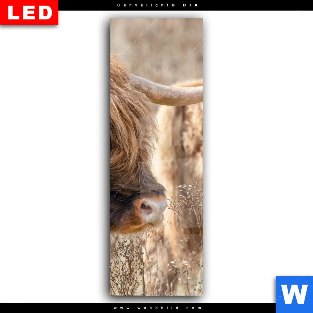 Wechselmotiv Acrylglas Canvalight® DIA | Hochlandrind auf Weide | Schmal