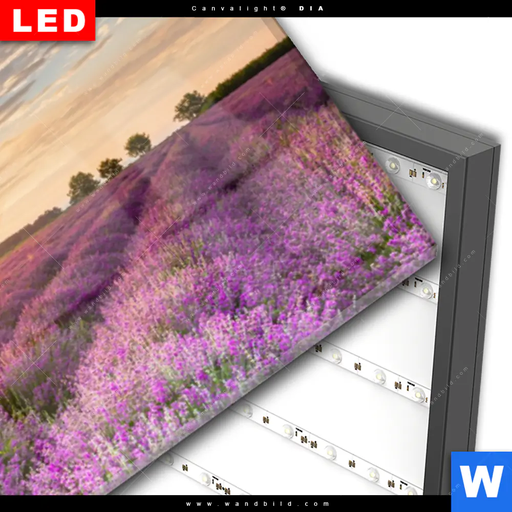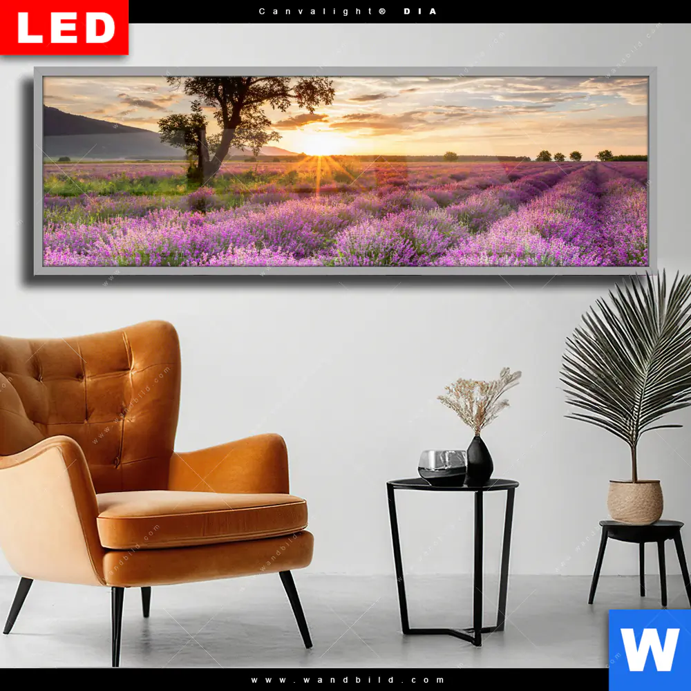 Wechselmotiv Acrylglas Canvalight® DIA | Sonnenaufgang im Lavendelfeld | Panorama