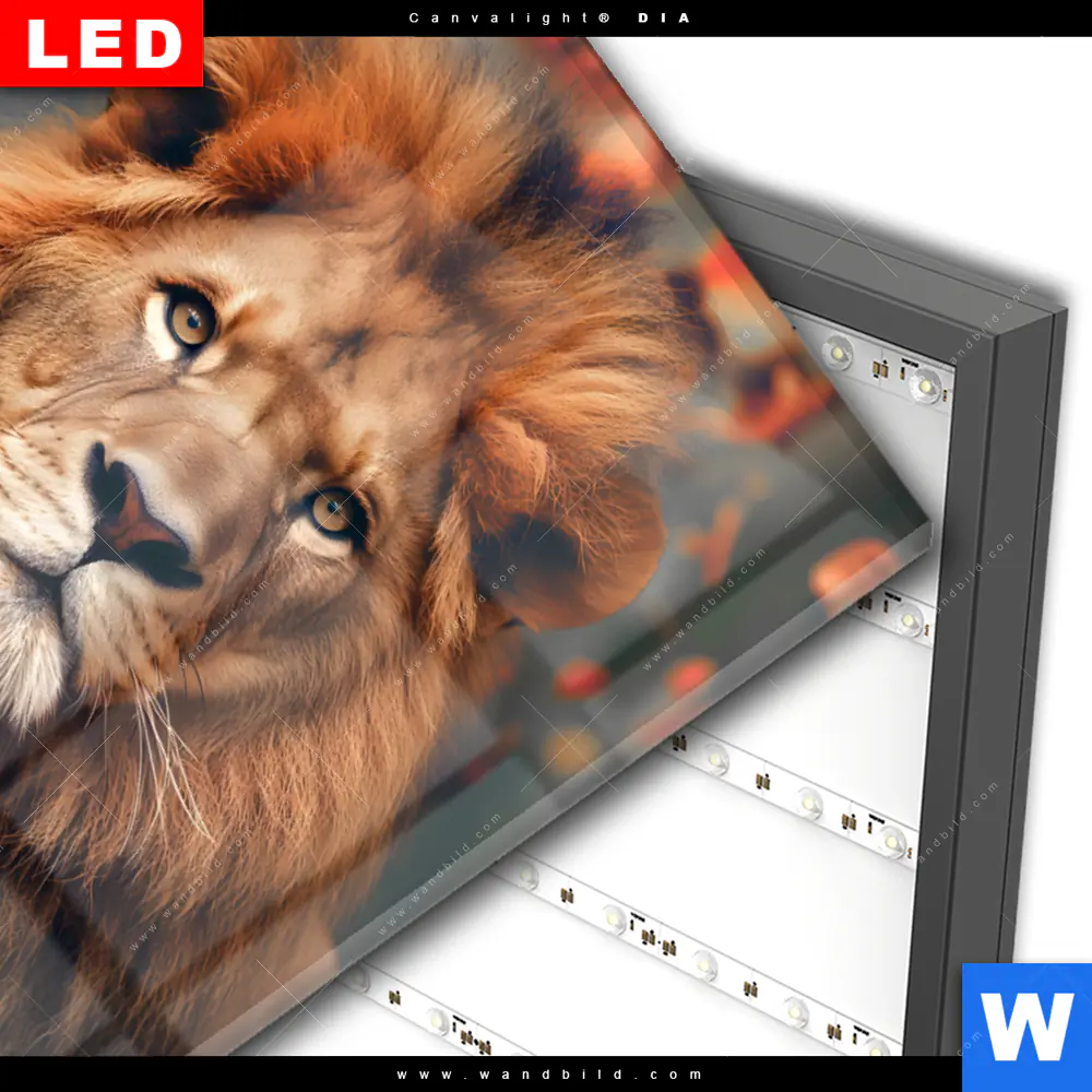 Wechselmotiv Acrylglas Canvalight® DIA | Stolzer Blick des Löwen | Hochformat