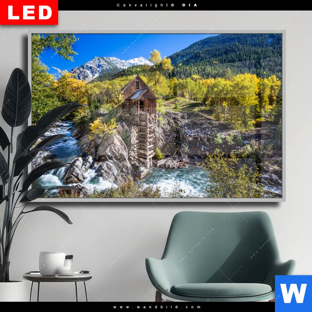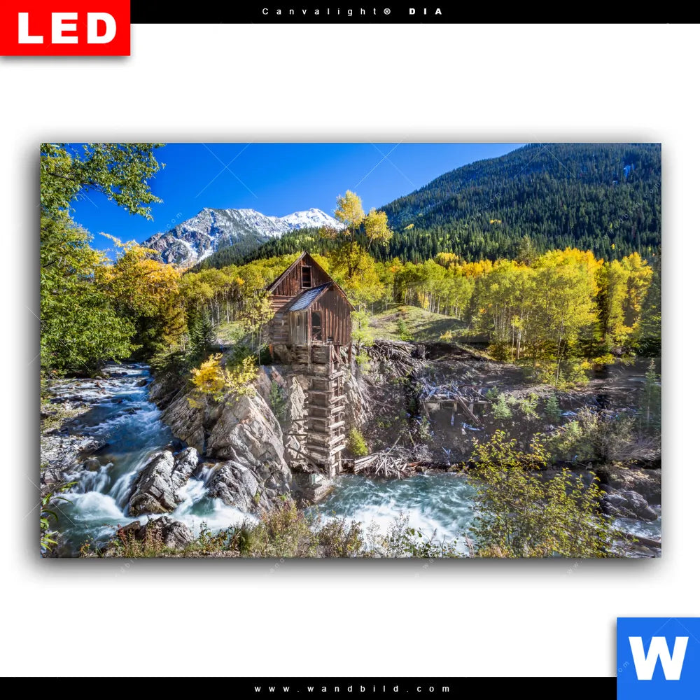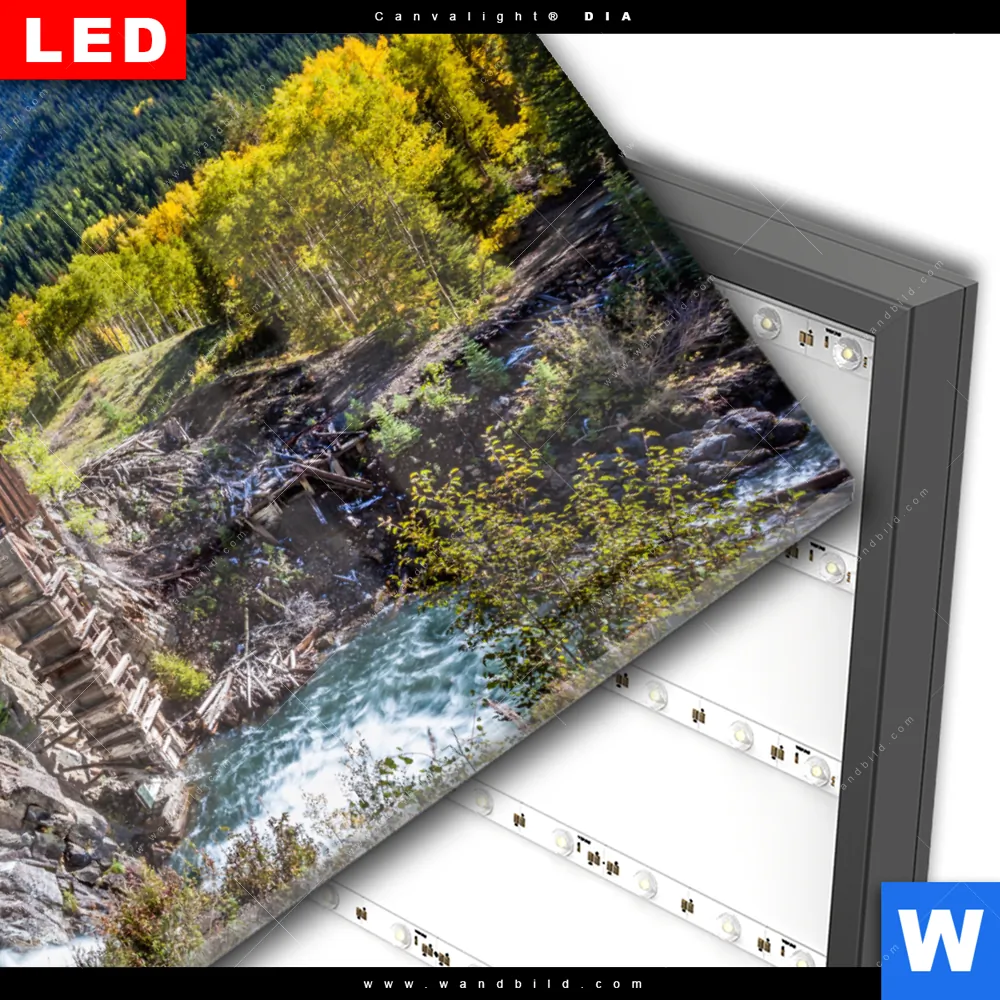Wechselmotiv Acrylglas Canvalight® DIA | Waldhütte am Fluss | Querformat