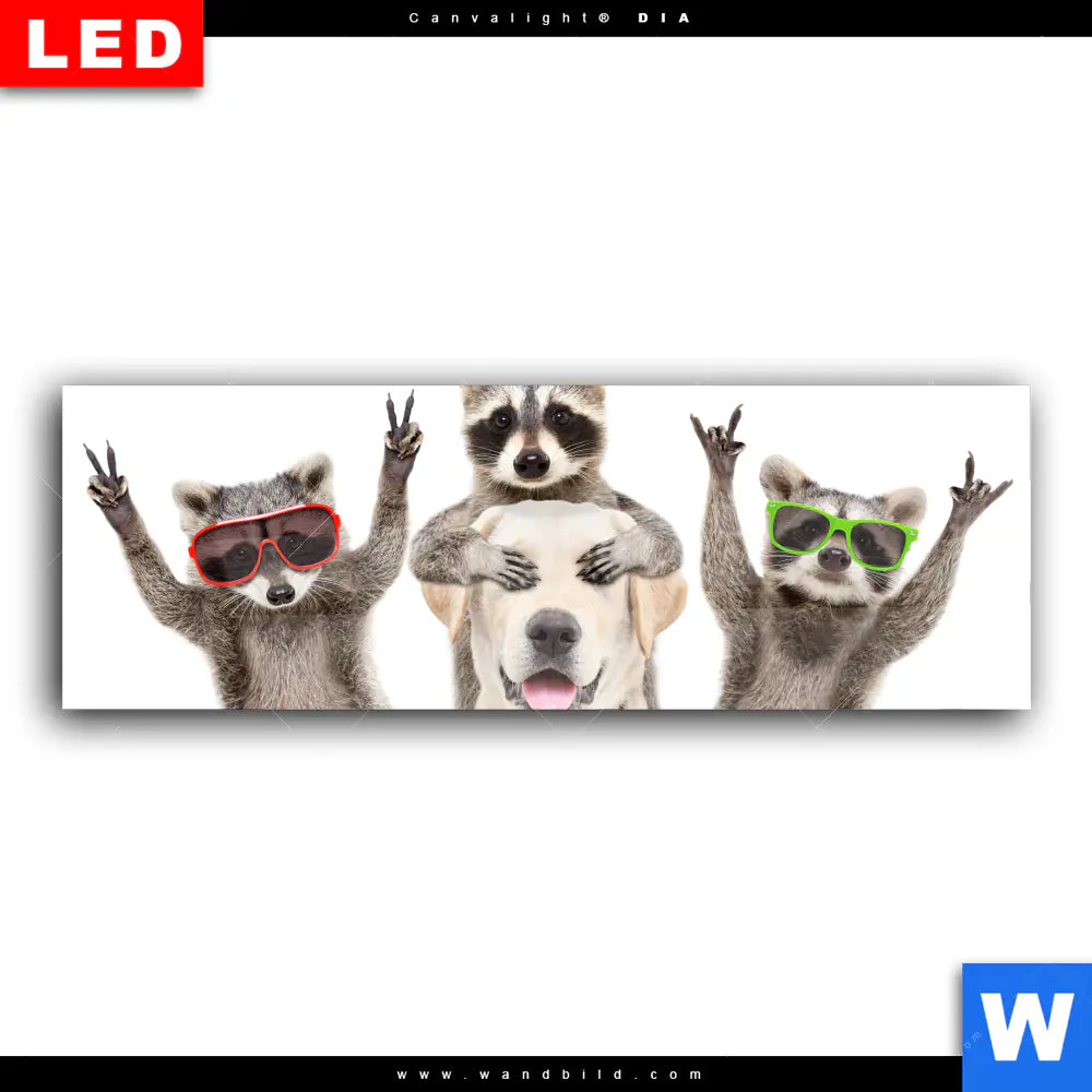 Wechselmotiv Acrylglas Canvalight® DIA | Lustige Waschbären mit Hund | Panorama