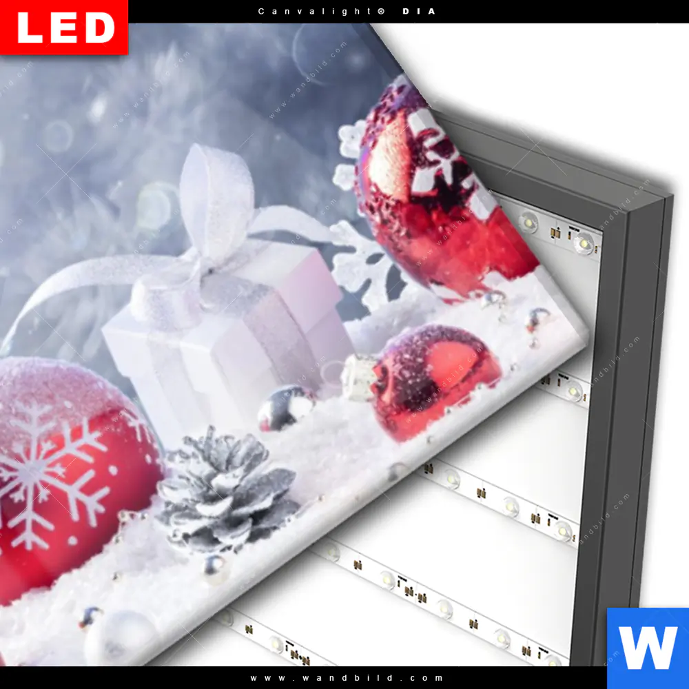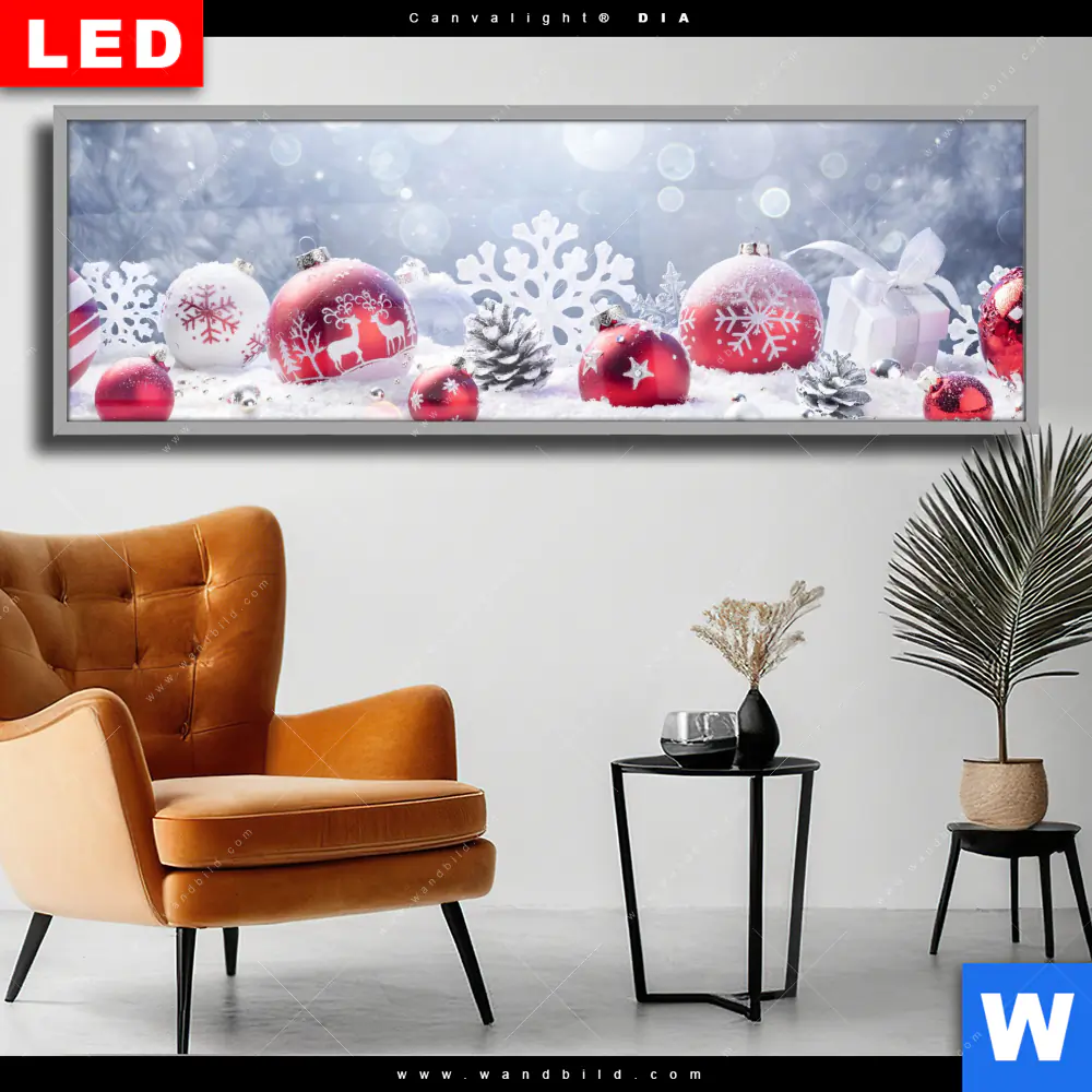 Wechselmotiv Acrylglas Canvalight® DIA | Weihnachtskugeln im Winterwunderland | Panorama