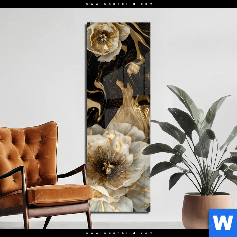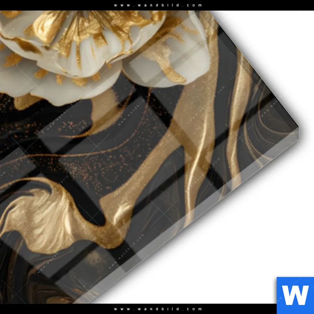 Acrylglasbild | Blüten Gold Weiß Schwarz | Schmal