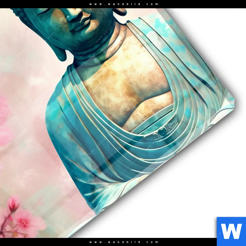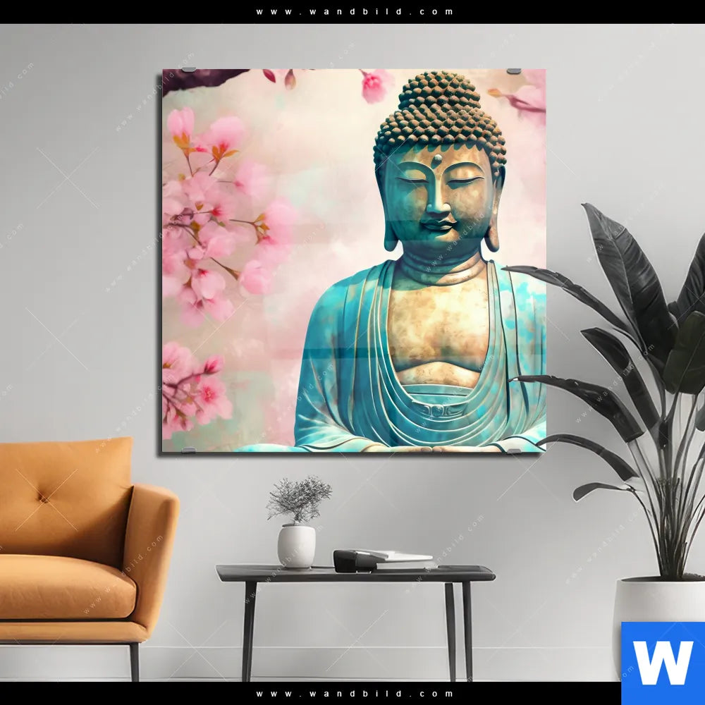 Acrylglasbild | Buddha Statue mit Kirschblüten | Quadrat