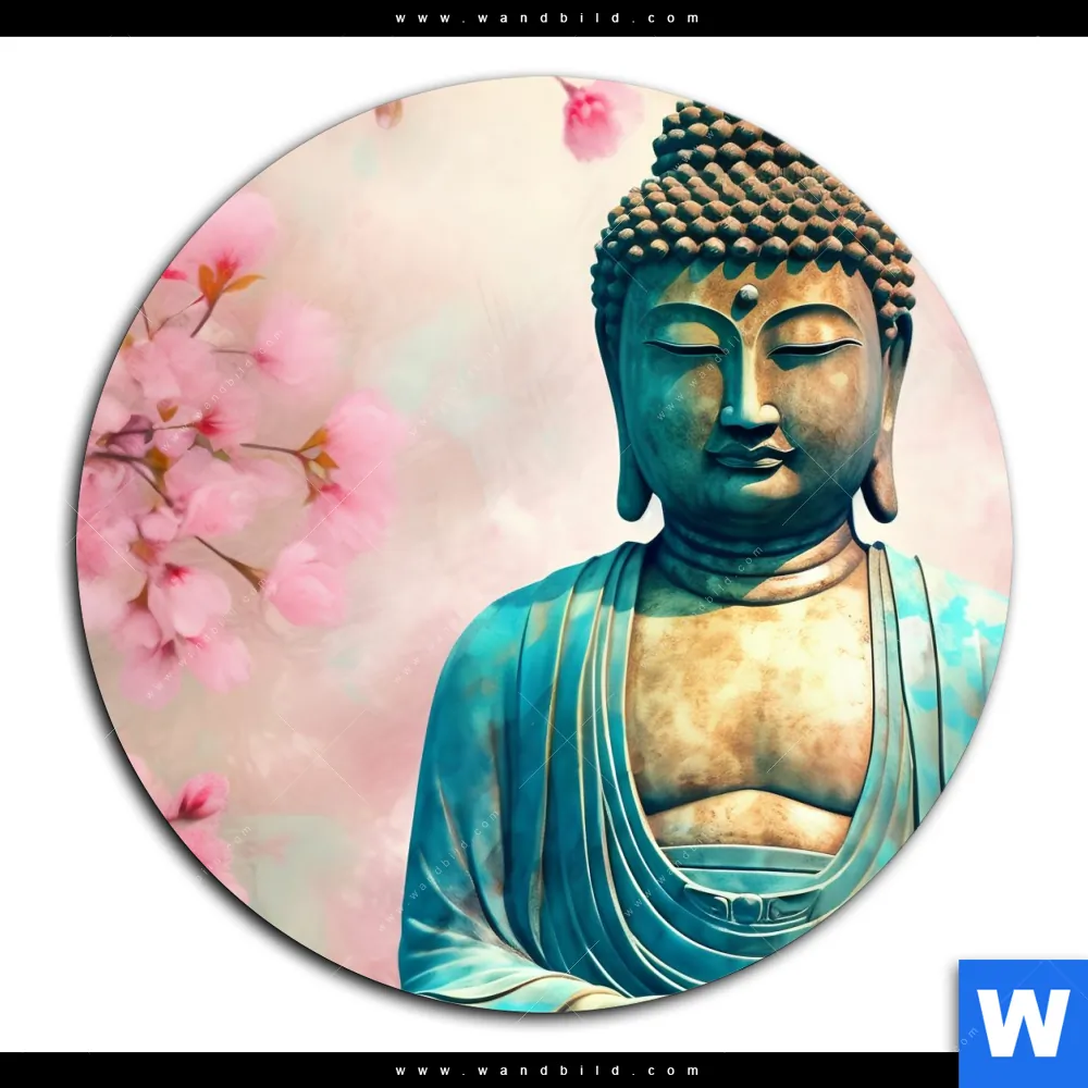 Acrylglasbild | Buddha Statue mit Kirschblüten | Rund