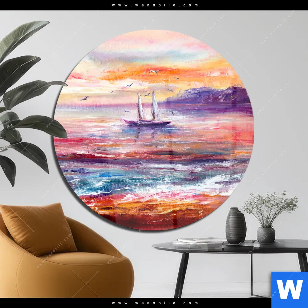 Acrylglasbild | Gemälde mit Boot im Sonnenuntergang | Rund
