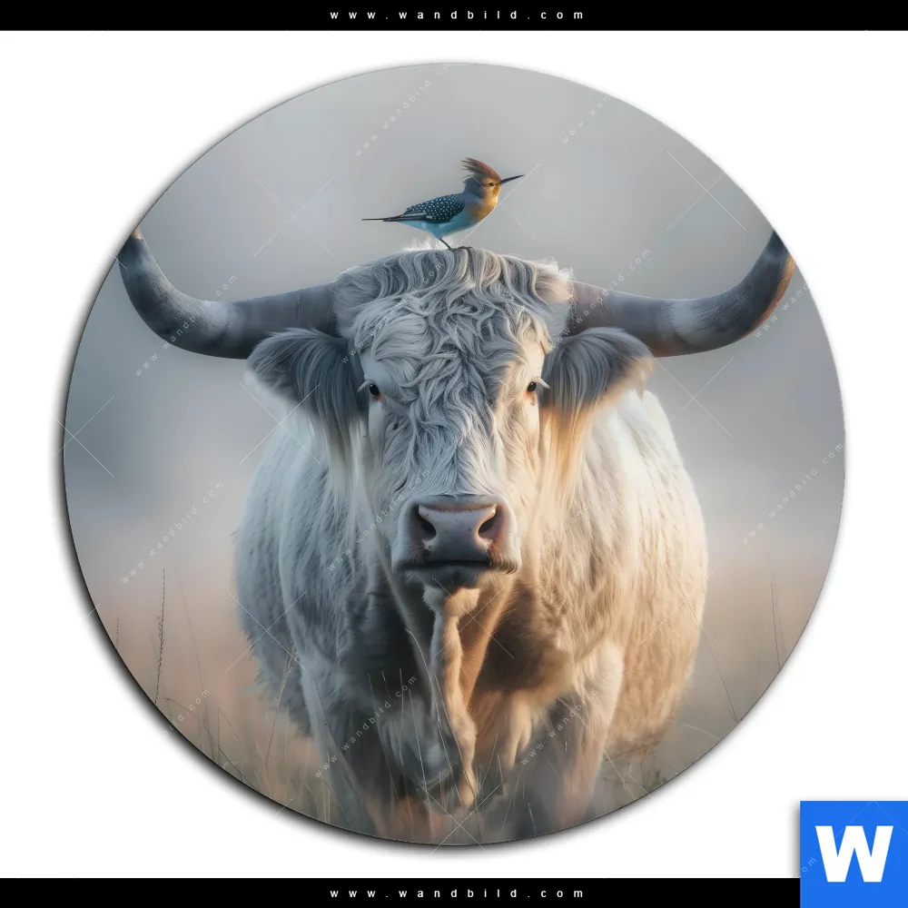 Acrylglasbild | Hochlandrind & bunter Vogel | Rund