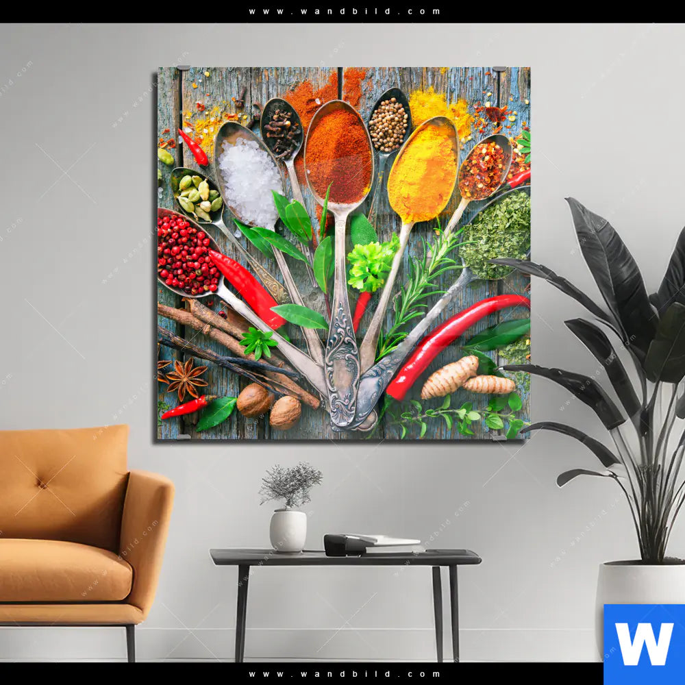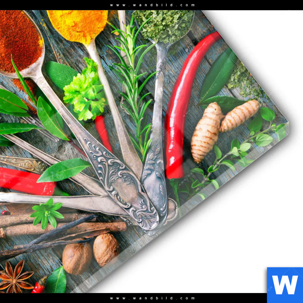 Acrylglasbild | Löffel mit Kräutern und Gewürzen | Quadrat