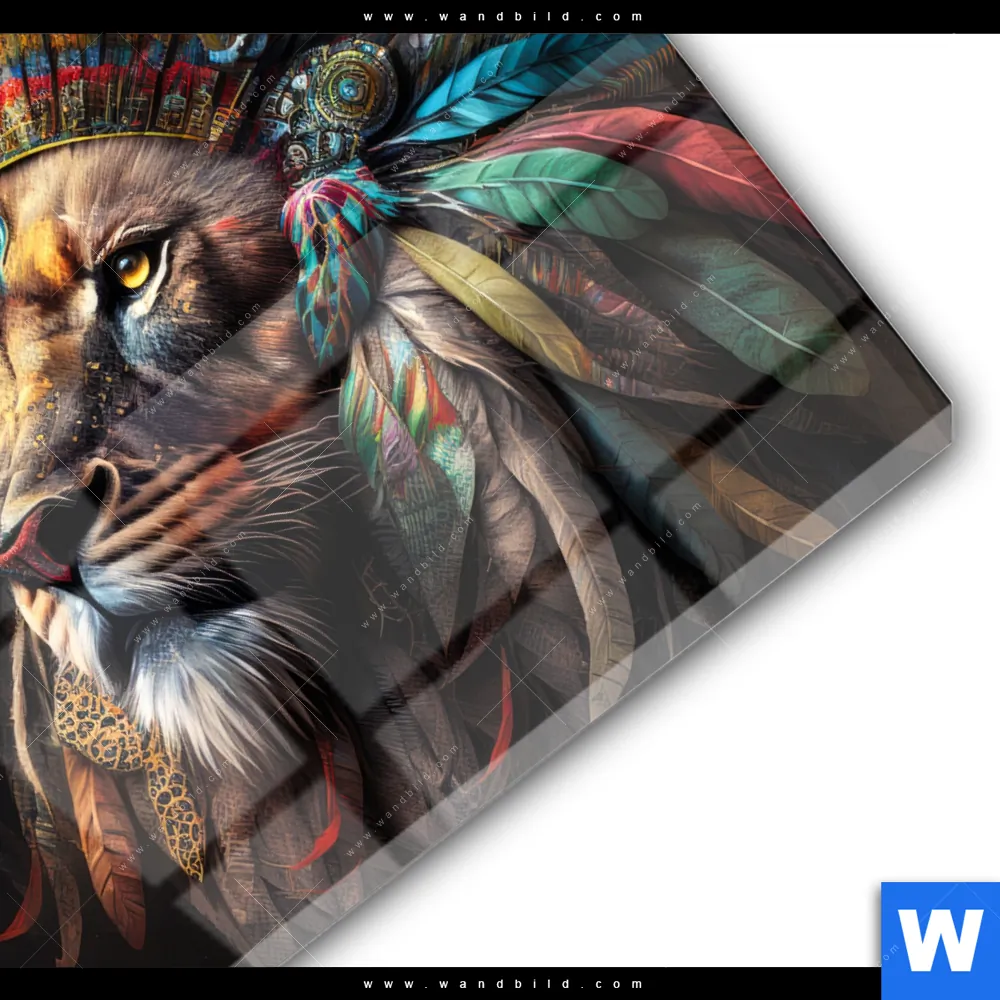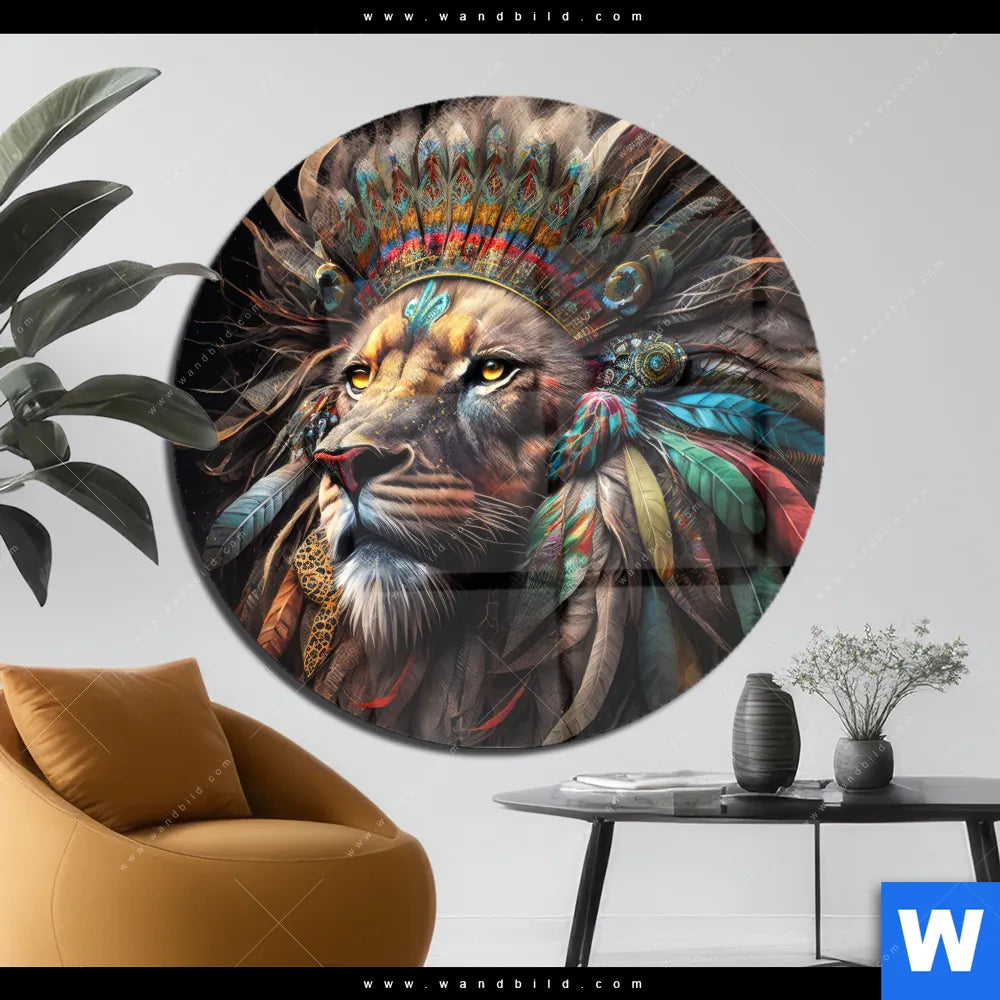 Acrylglasbild | Löwenkopf mit bunten Federn | Rund