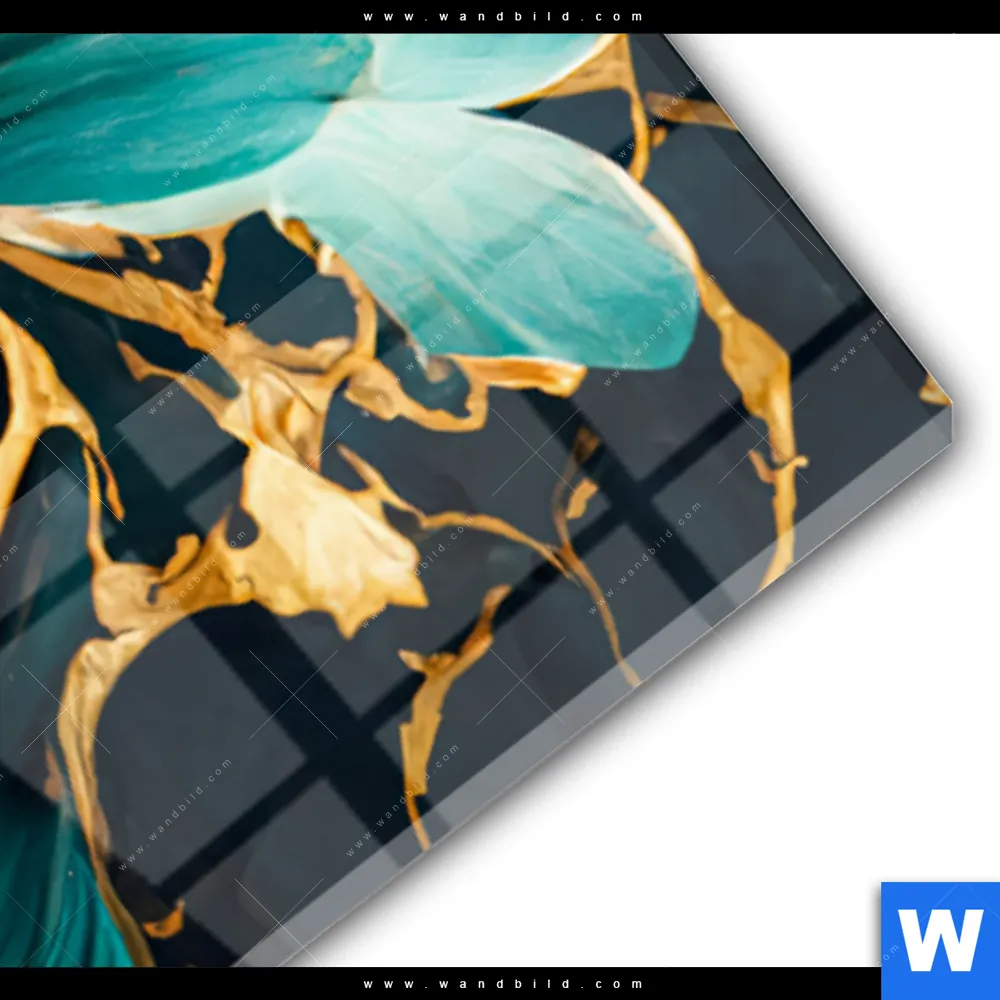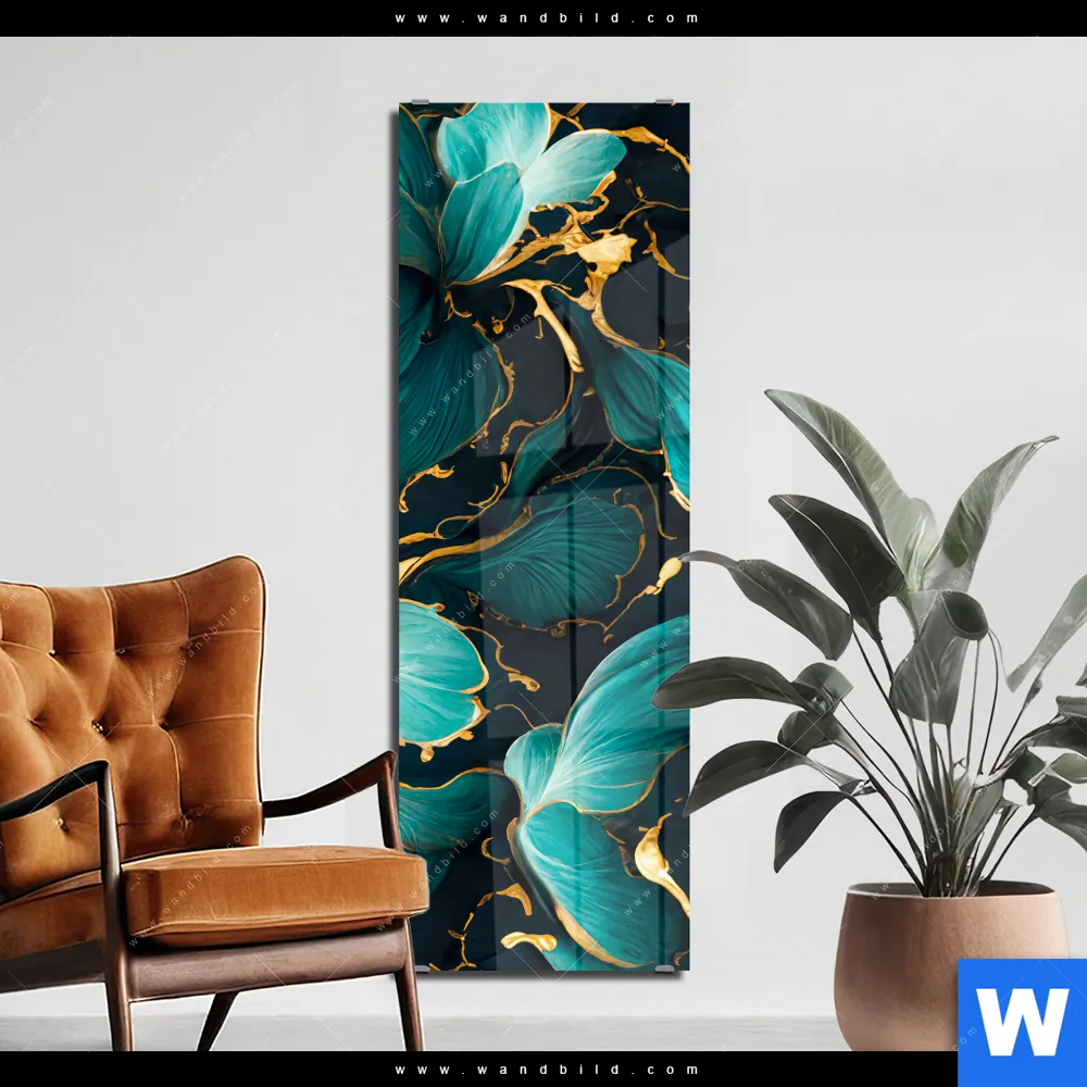 Acrylglasbild | Marmor Blüten in türkis & gold | Schmal