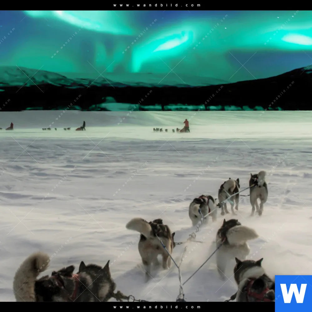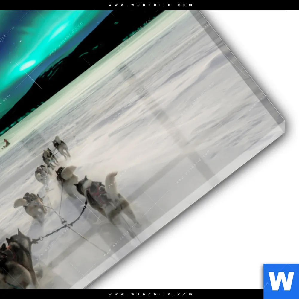 Acrylglasbild | Nordlichter und Schlittenhunde | Querformat