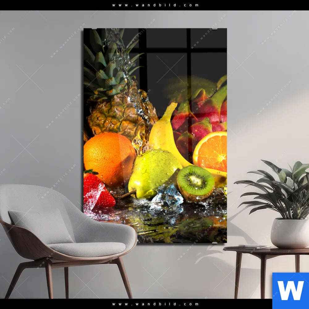 Acrylglasbild | Obst-in spritzendem Wasser | Hochformat