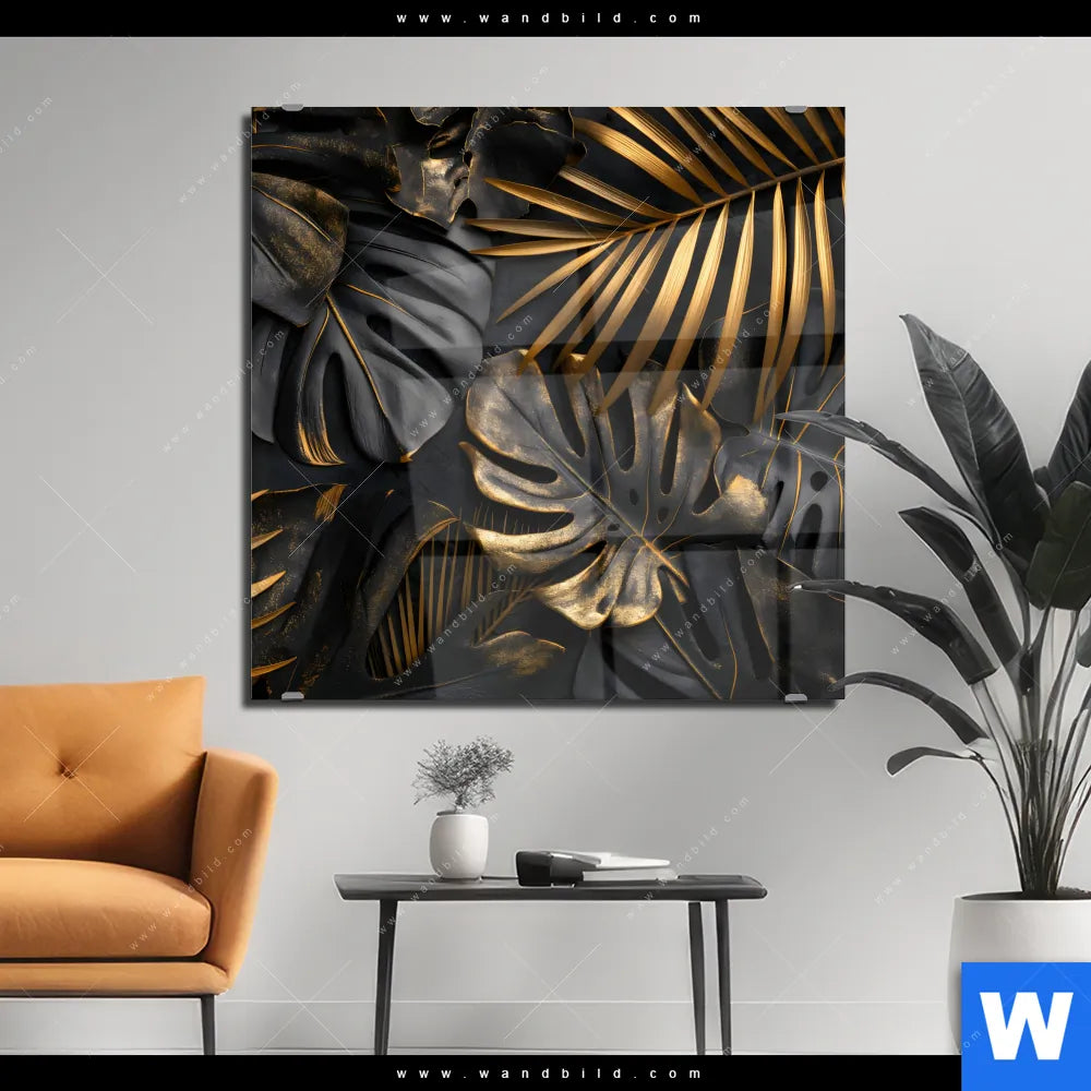 Acrylglasbild | Palmenblätter Schwarz Gold | Quadrat