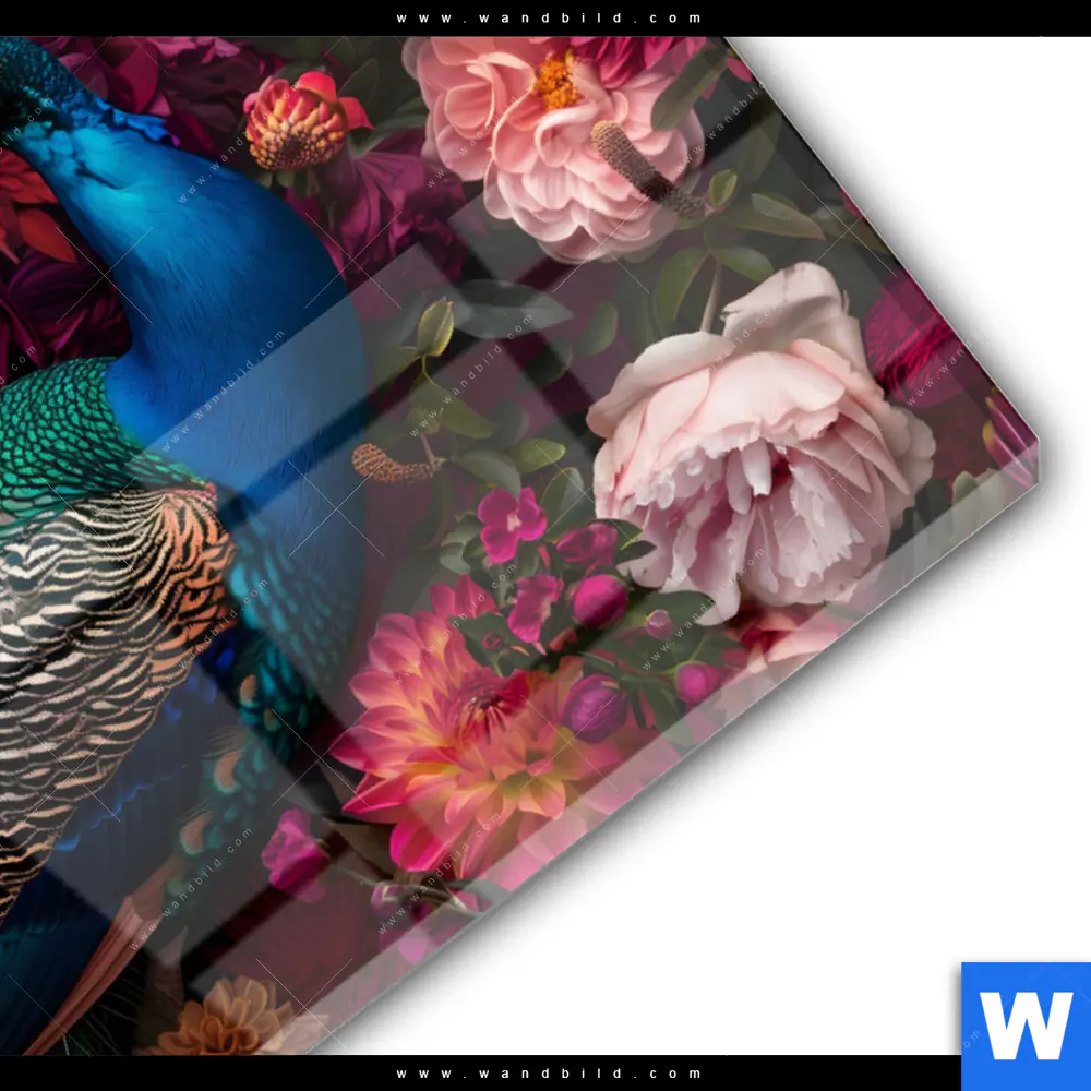 Acrylglasbild | Prachtvoller Pfau und Blüten | Querformat