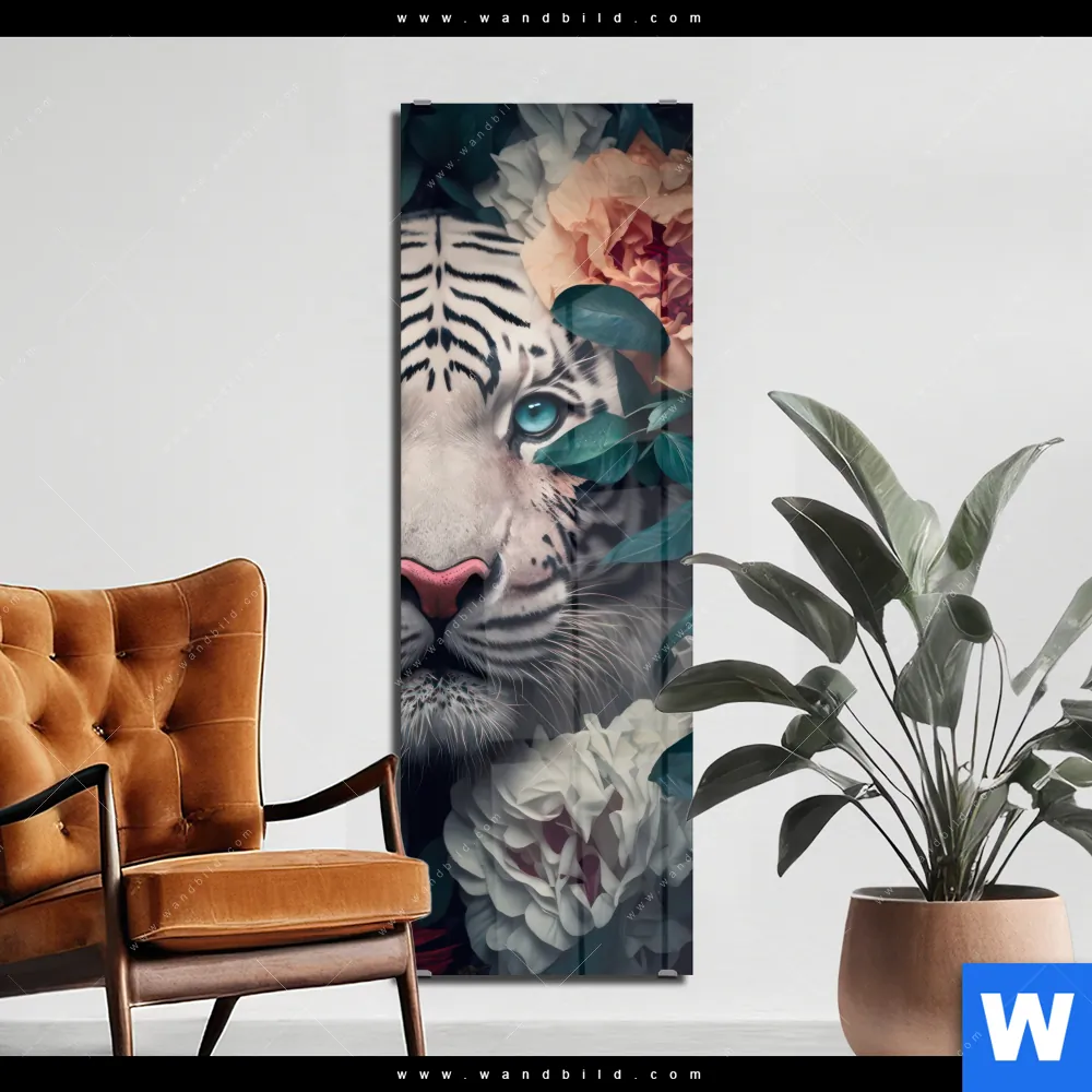 Acrylglasbild | Weißer Tiger mit blauen Augen zwischen Blumen | Schmal