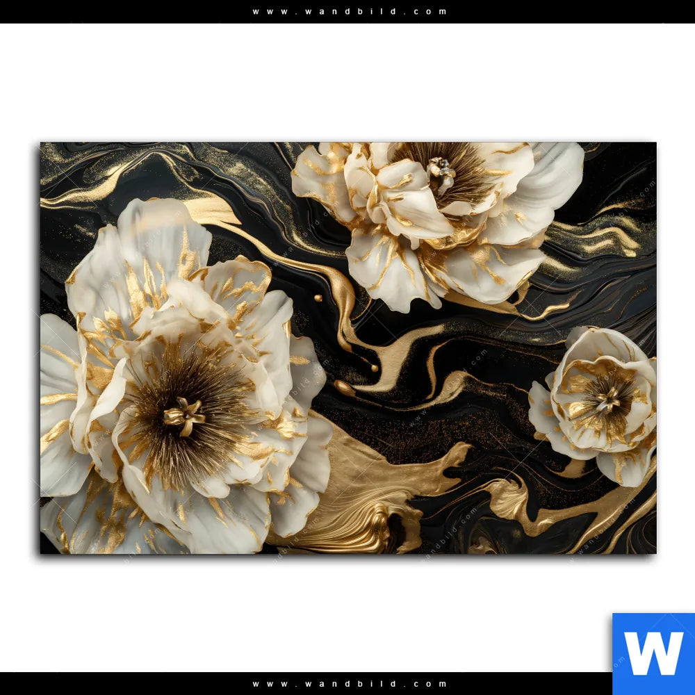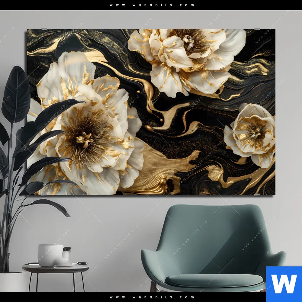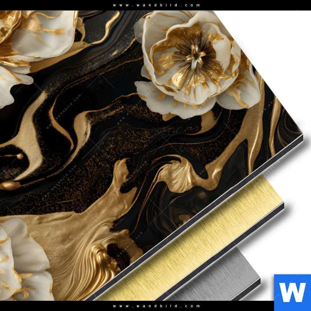 Alu-Dibond Bild | Blüten Gold Weiß Schwarz | Querformat