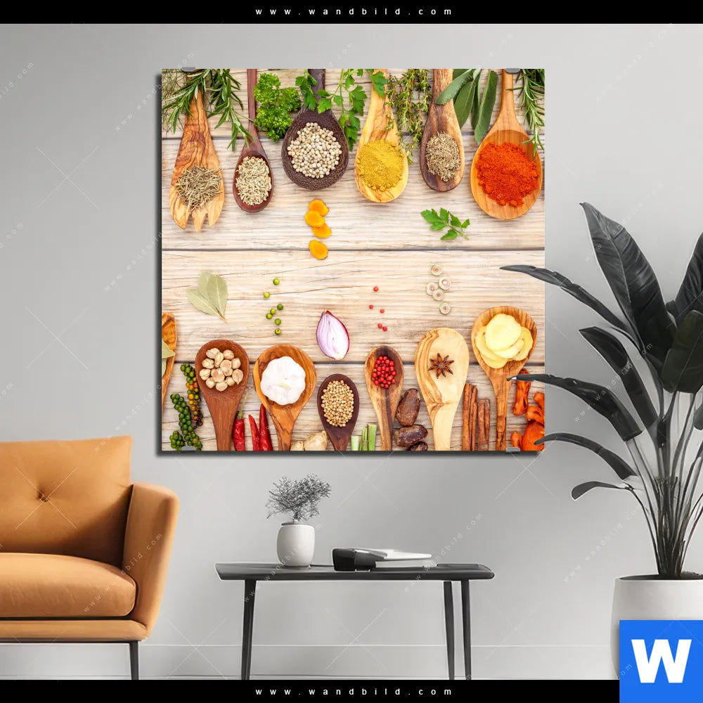 Alu-Dibond Bild | Gewürze auf hölzernen Löffeln | Quadrat