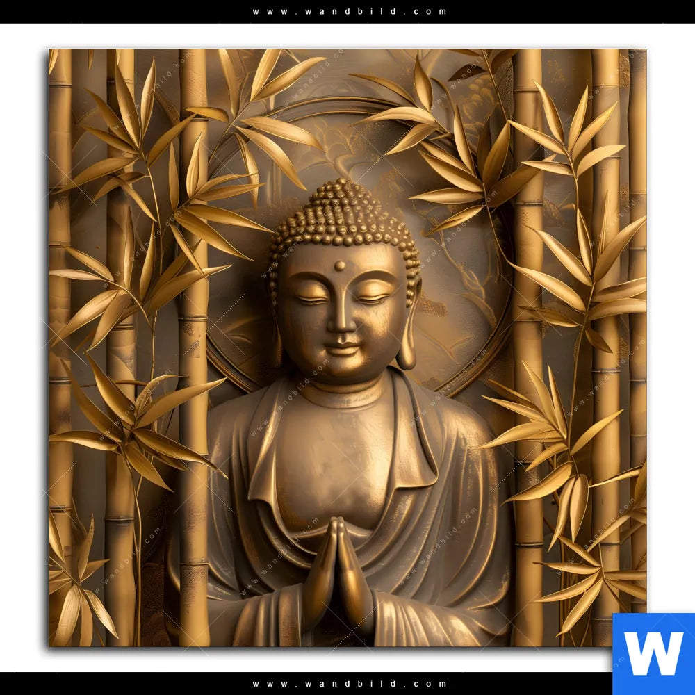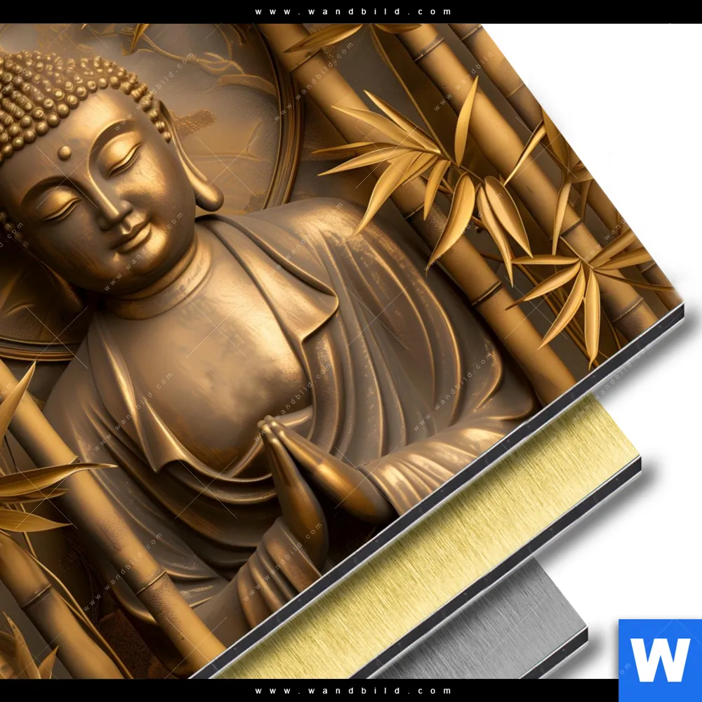 Alu-Dibond Bild | Goldener Buddha im Bambuswald | Quadrat